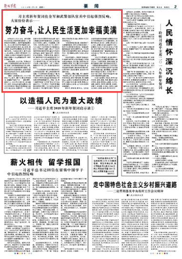 在2018新年鐘聲即將敲響之際,習(xí)主席發(fā)表的新年賀詞,言之諄諄、意之殷殷,在全軍和武警部隊官兵中引起強烈反響。大家堅決表示,要不忘初心,牢記使命,認真學(xué)習(xí)貫徹黨的十九大精神,為實現(xiàn)中華民族偉大復(fù)興的中國夢不懈奮斗,為全面建成世界一流軍隊貢獻力量。請關(guān)注今日出版的《解放軍報》的詳細報道——