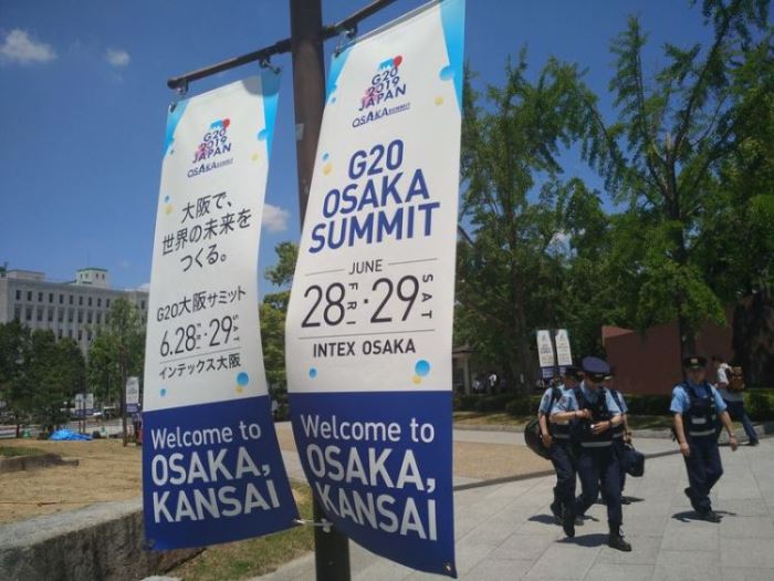 在著名景點大阪城附近,幾名警察從標有“在大阪創(chuàng)造世界未來”字樣的條幅旁走過。新華社記者龐興雷攝 “在大阪創(chuàng)造世界未來”——本次峰會的宣傳口號,反映出面對單邊主義和保護主義嚴重沖擊國際經(jīng)濟秩序的形勢,東道國日本對與會各方凝心聚力拉動世界經(jīng)濟、改善全球治理的期待。
