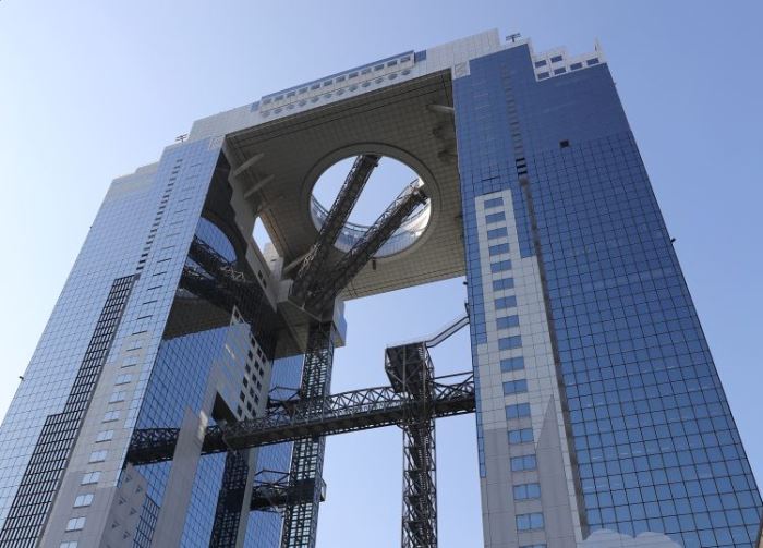 大阪梅田藍天大廈。藍天大廈是大坂府大坂市北區(qū)新梅田城的摩天大樓。地上40層樓、地下2層,高度約為173米,1993年3月完工。新華社記者杜瀟逸攝 站在梅田藍天大廈頂層巨大的圓形眺望臺鳥瞰大阪市區(qū),眺望臺運營主管三田晴彥對記者說:“圓形寓意團結(jié),期待即將舉行的這次峰會能夠成為一次團結(jié)的會議,帶給人們希望。”