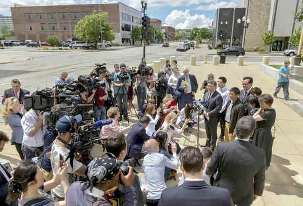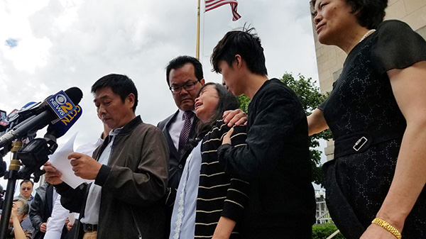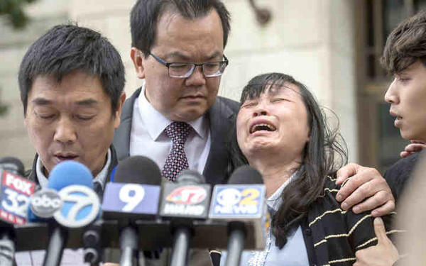 章瑩穎家人參加記者發(fā)布會(huì)。WTTW News 圖 家人相擁而泣:相信審判最終會(huì)帶來(lái)正義 在宣告有罪裁定后,章瑩穎的家人相擁而泣,在法庭外,父親章榮高用嗚咽的聲音向等候多時(shí)的媒體朗讀了一份中文聲明: “我代表我們親愛(ài)的女兒,我的妻子、兒子和我自己,感謝陪審團(tuán)為伸張正義所作的第一步。我們感謝檢察官、伊利諾伊大學(xué)的警官、FBI探員,和所有在本案的調(diào)查和庭審中提供幫助的人。我們感謝在中國(guó)、美國(guó)和世界各地幫助和支持我們的朋友們, 尤其感謝香檳和皮奧利亞華人協(xié)會(huì)和教會(huì)的朋友們?yōu)槲覀兩钌咸峁┑膸椭赡陙?lái),我們每天都想念著瑩穎。直到今天,我們也無(wú)法想象如何在沒(méi)有她的情況下度過(guò)余生,言語(yǔ)無(wú)法描述我們的痛苦和煎熬。我們希望并且相信審判最終會(huì)為瑩穎和我們帶來(lái)正義。我們的愿望永遠(yuǎn)都是找到瑩穎,帶她回家。我們不會(huì)放棄! 據(jù)章瑩穎家人的律師王志東向澎湃新聞(www.thepaper.cn)介紹,當(dāng)天上午11點(diǎn),控辯雙方在發(fā)表完結(jié)案陳詞后,法庭進(jìn)行了休庭,法官宣布由12人組成的陪審團(tuán)進(jìn)行閉門討論,兩個(gè)小時(shí)后重新開(kāi)庭,陪審團(tuán)宣布嫌犯有罪,審判隨即進(jìn)入第二階段,即量刑階段,同一個(gè)陪審團(tuán)接下來(lái)將決定克里斯滕森將被判處終身監(jiān)禁或是死刑。
