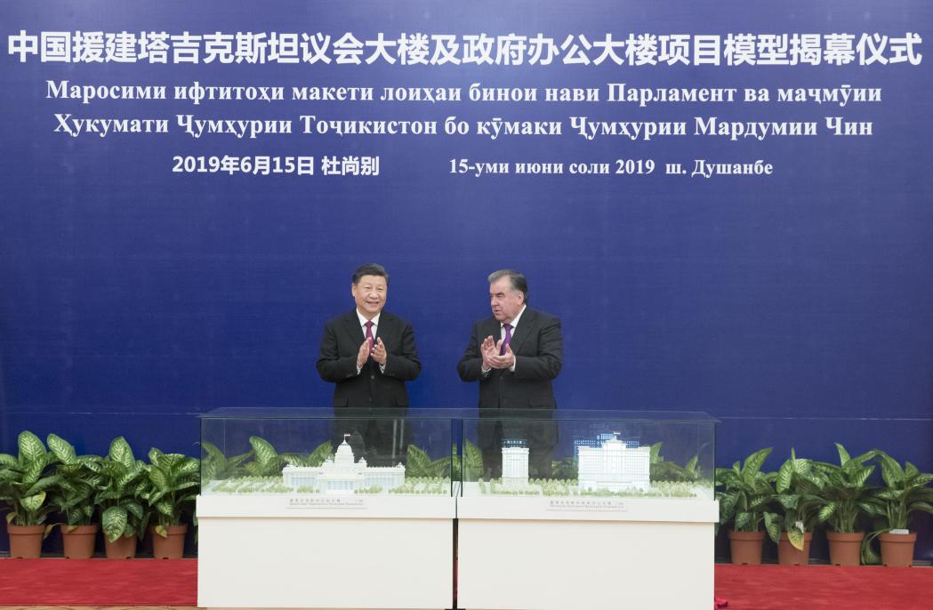 2019年6月15日,習近平在杜尚別同塔吉克斯坦總統(tǒng)拉赫蒙共同出席中方援塔議會大樓、政府辦公大樓項目模型揭幕儀式。 6月15日,塔吉克斯坦總統(tǒng)府儀式廳,習近平和拉赫蒙共同出席了中方援塔議會大樓、政府辦公大樓項目模型揭幕儀式。覆蓋在沙盤上的紅綢緞徐徐揭開,兩座建筑模型展現(xiàn)在眼前,F(xiàn)場響起熱烈掌聲。