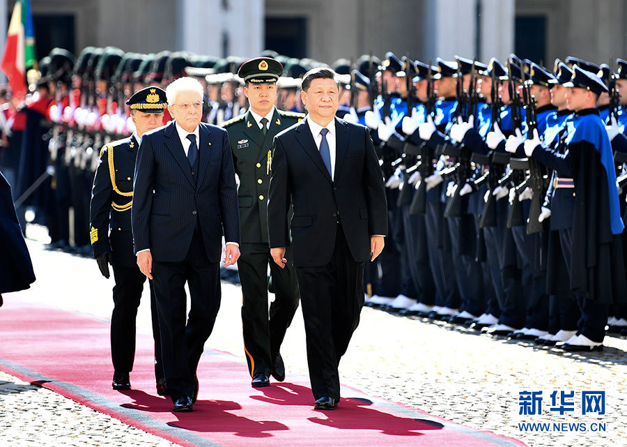 3月21日,國家主席習近平乘專機抵達羅馬,開始對意大利共和國進行國事訪問。這是習近平和夫人彭麗媛步出艙門。新華社記者 王曄 攝 3月21日傍晚,習近平主席乘坐專機,從“千年古都”北京飛抵“永恒之城”羅馬。 奎里納萊宮,意大利總統府,因收藏著大量藝術珍品而聞名于世。3月22日上午,馬塔雷拉總統在這里為習近平主席舉行盛大歡迎儀式。馬蹄陣陣,踏響古道,在威武挺拔的意大利騎兵護衛(wèi)下,習近平主席夫婦乘車抵達內庭廣場。這是近10年來意大利首次在歡迎外國元首的儀式中安排馬隊迎接。