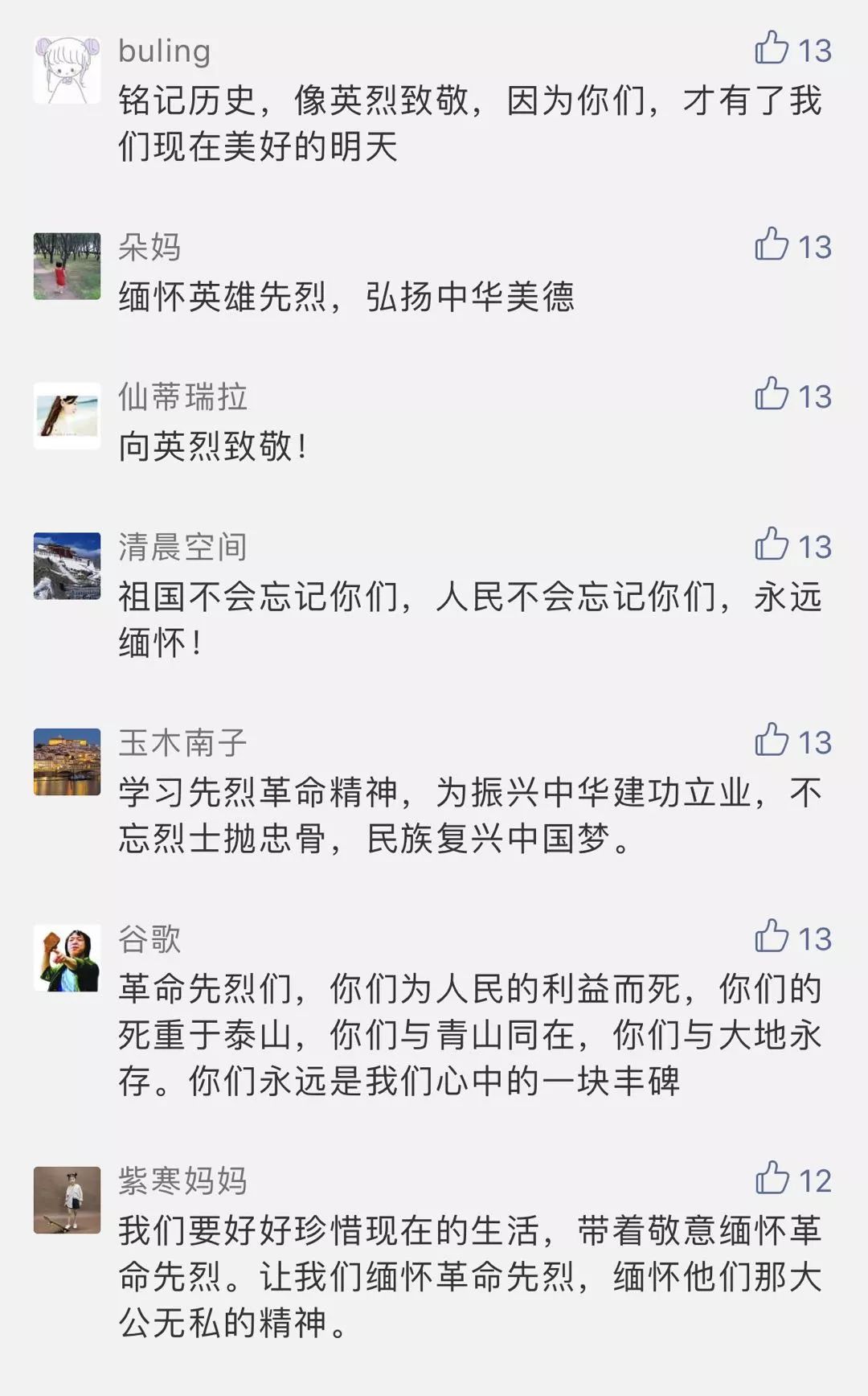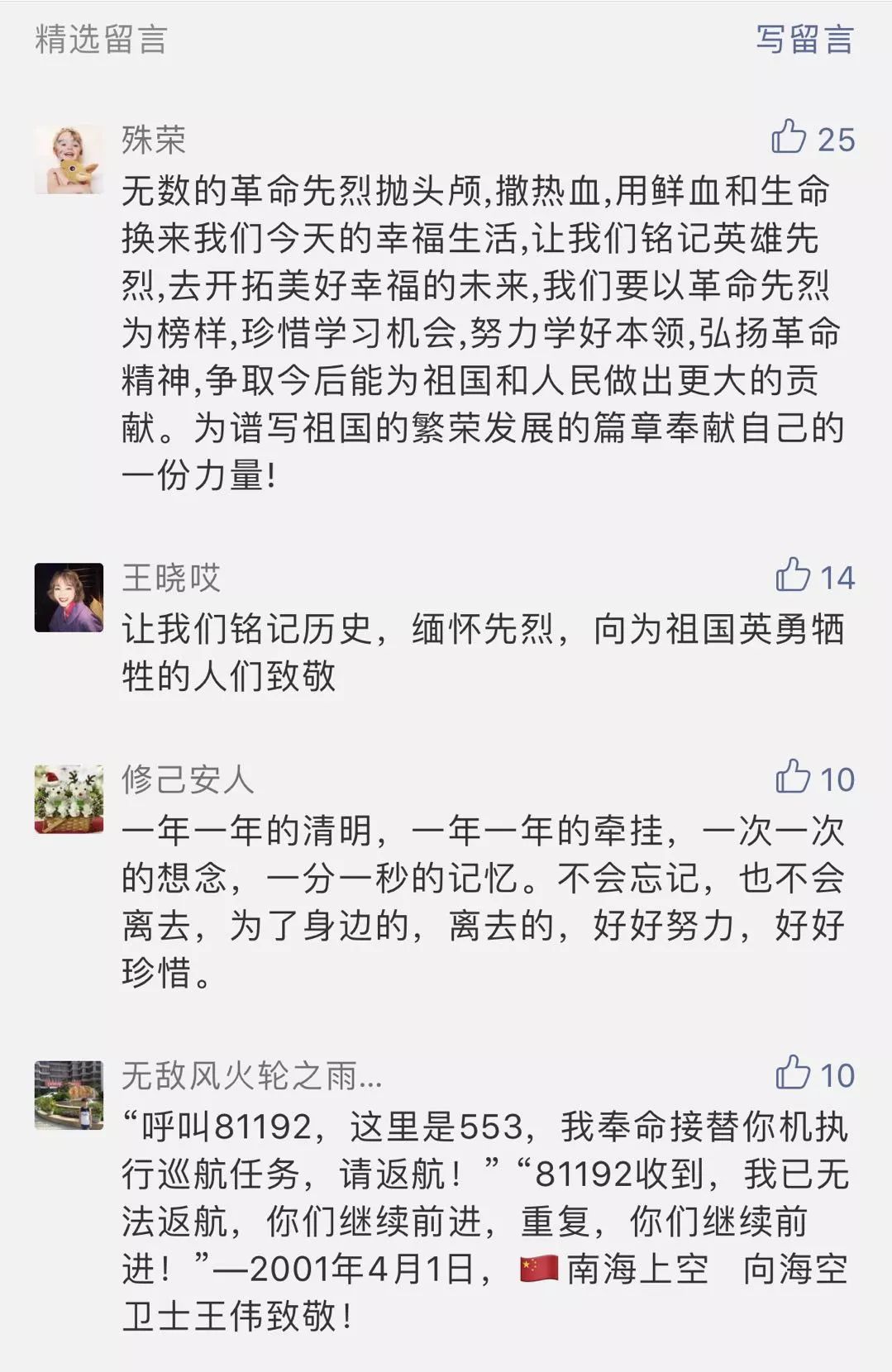 祭奠英烈,我們從未忘記我們寧?kù)o安穩(wěn)的今天 正是無(wú)數(shù)烈士用熱血和生命點(diǎn)亮的明天 在2019網(wǎng)上祭英烈活動(dòng)中 廣大網(wǎng)友紛紛留言 “祭奠英烈,我們從未忘記”