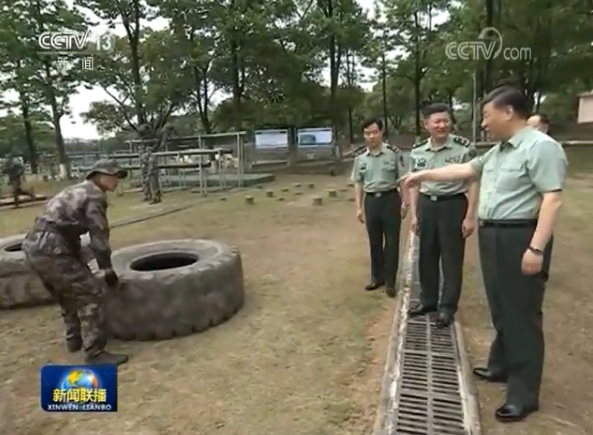 學(xué)院訓(xùn)練場(chǎng)上,學(xué)員們生龍活虎、喊聲震天,一派實(shí)戰(zhàn)化練兵景象。習(xí)近平走到障礙訓(xùn)練場(chǎng)旁,察看學(xué)員進(jìn)行障礙訓(xùn)練情況。極限訓(xùn)練對(duì)于錘煉學(xué)員體能極限、意志極限、心理極限,提高戰(zhàn)場(chǎng)適應(yīng)能力很有意義。習(xí)近平步行進(jìn)入極限訓(xùn)練場(chǎng),詳細(xì)了解有關(guān)訓(xùn)練設(shè)施和訓(xùn)練情況。學(xué)員們進(jìn)行了阻絕墻跳水、翻越懶人梯、跨越步步高、翻越高墻、攀爬云梯、攀越高空蕩木橋、扛圓木等訓(xùn)練?吹綄W(xué)員們摸爬滾打一身泥水,迎著障礙一往無(wú)前,習(xí)近平很高興。