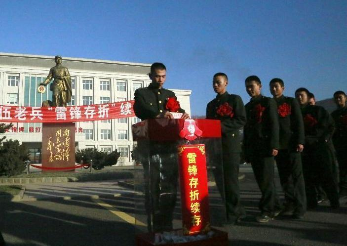 連隊?wèi)?zhàn)士共同為“雷鋒存折”續(xù)存 雷鋒生前將每月節(jié)省下來的津貼存下來,多次以部隊名義向社會捐贈。2010年,“雷鋒班”發(fā)起續(xù)存“雷鋒存折”活動,至今,全國21個省區(qū)市都收到過以“雷鋒”為名的捐款。