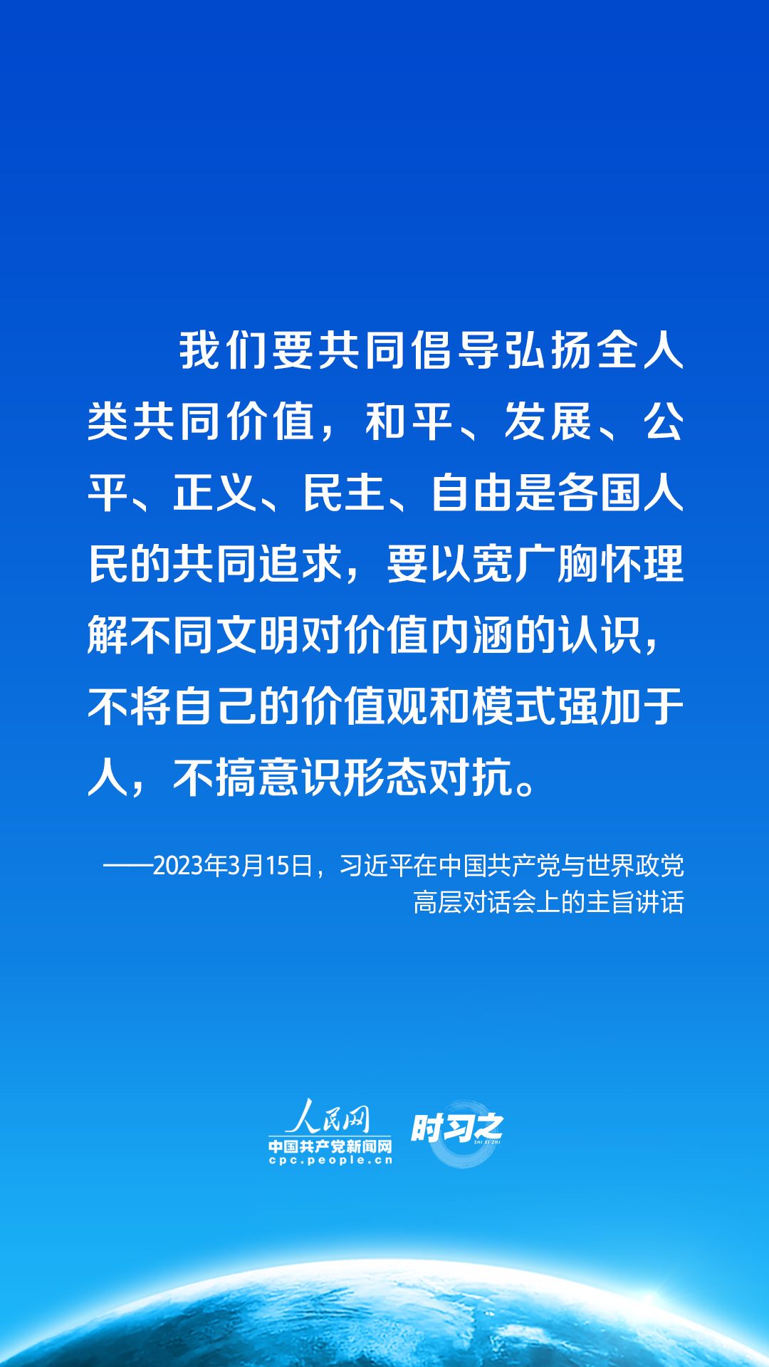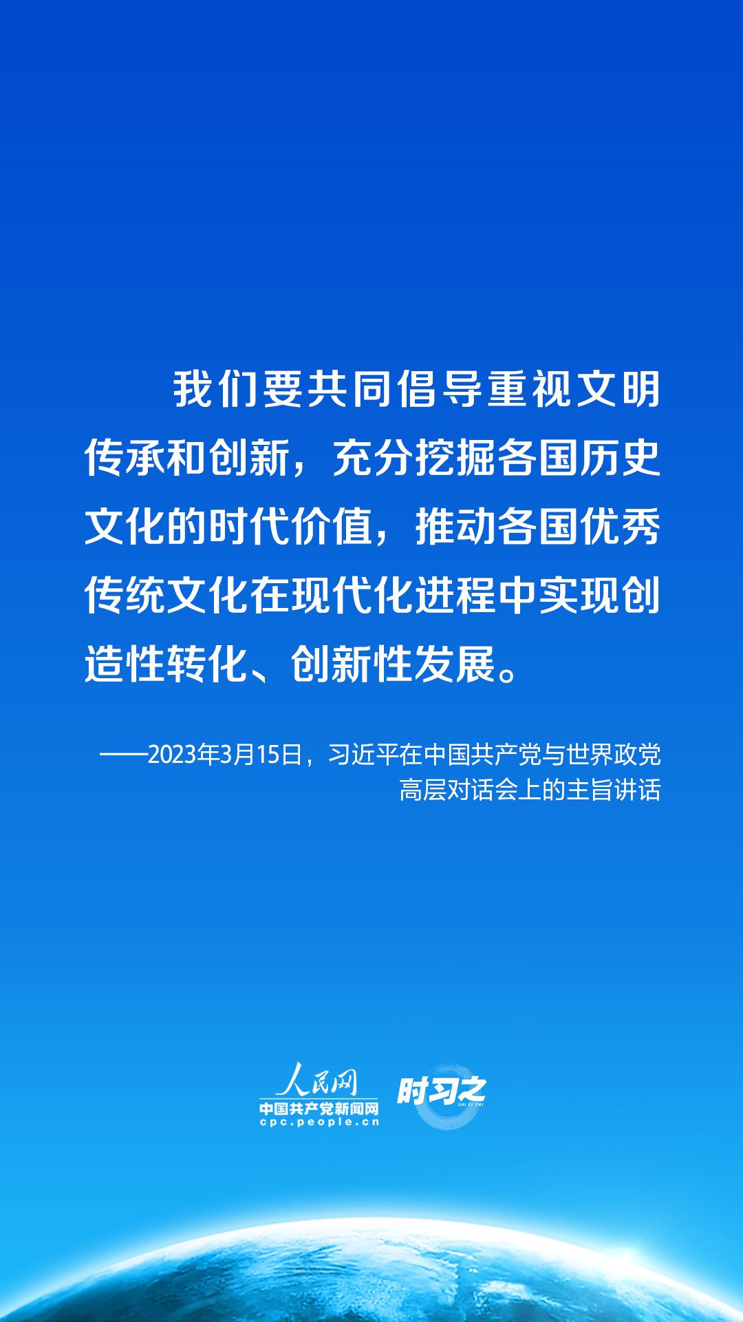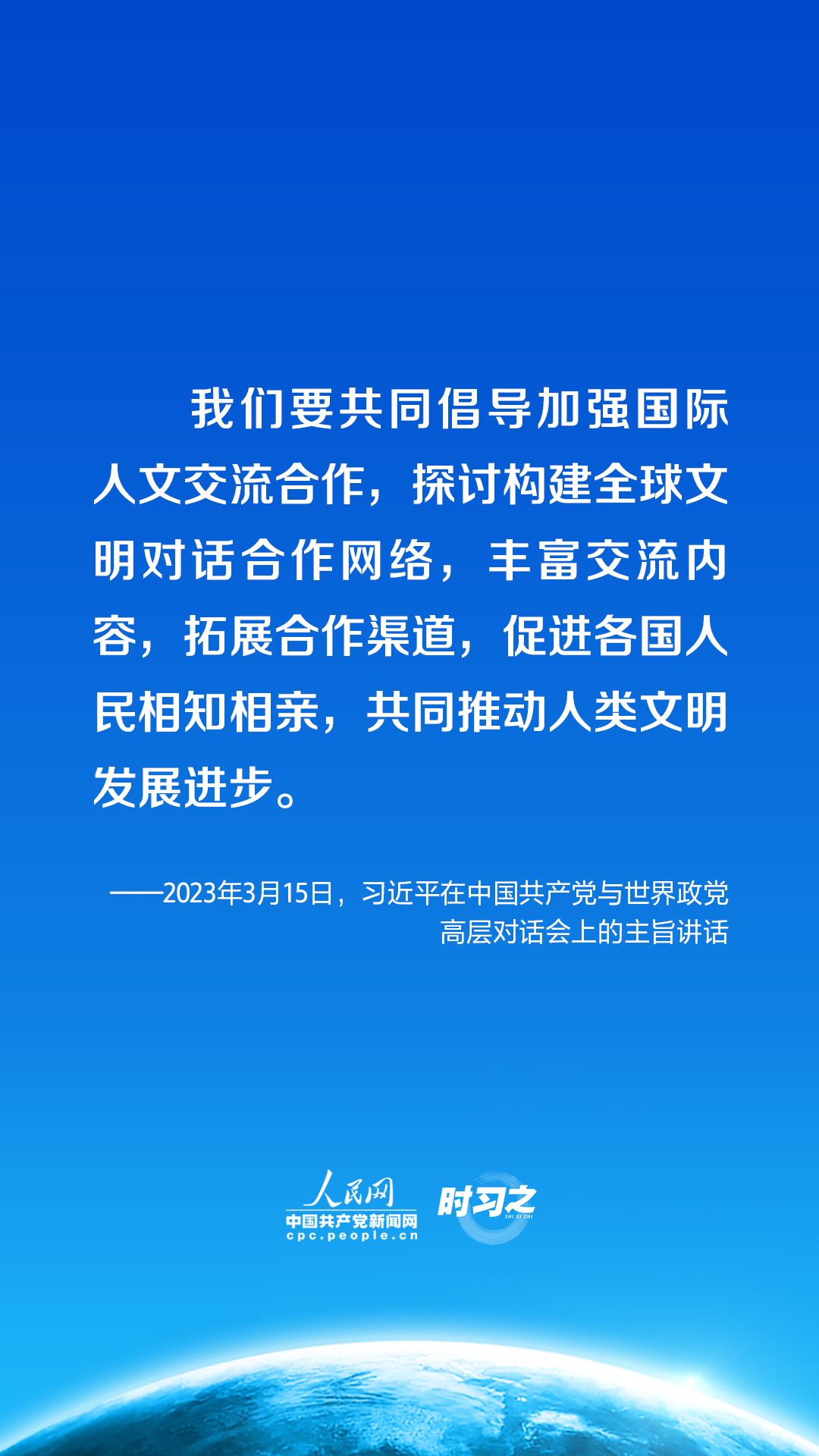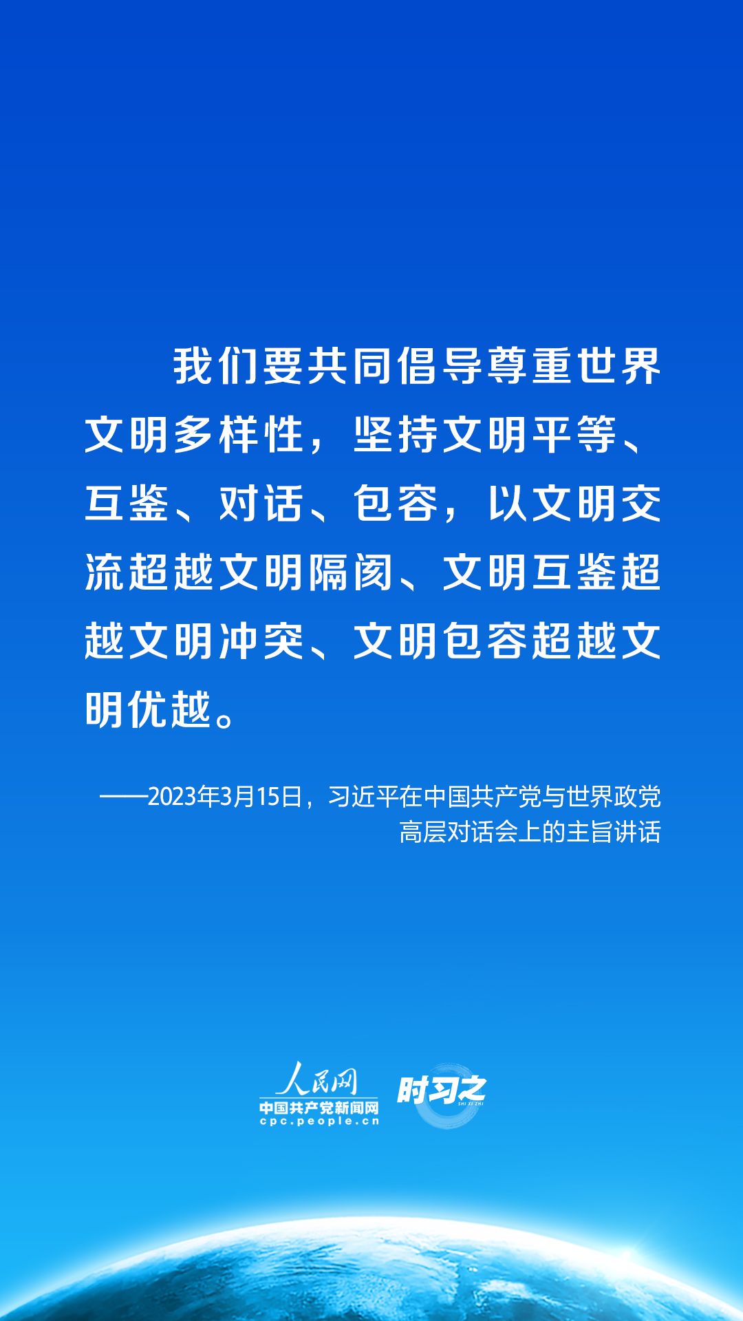 時習(xí)之丨促進(jìn)全球文明交流互鑒 習(xí)近平提出四點(diǎn)倡議3月15日,中共中央總書記、國家主席習(xí)近平在北京出席中國共產(chǎn)黨與世界政黨高層對話會,并發(fā)表題為《攜手同行現(xiàn)代化之路》的主旨講話。講話中,習(xí)近平提出全球文明倡議。