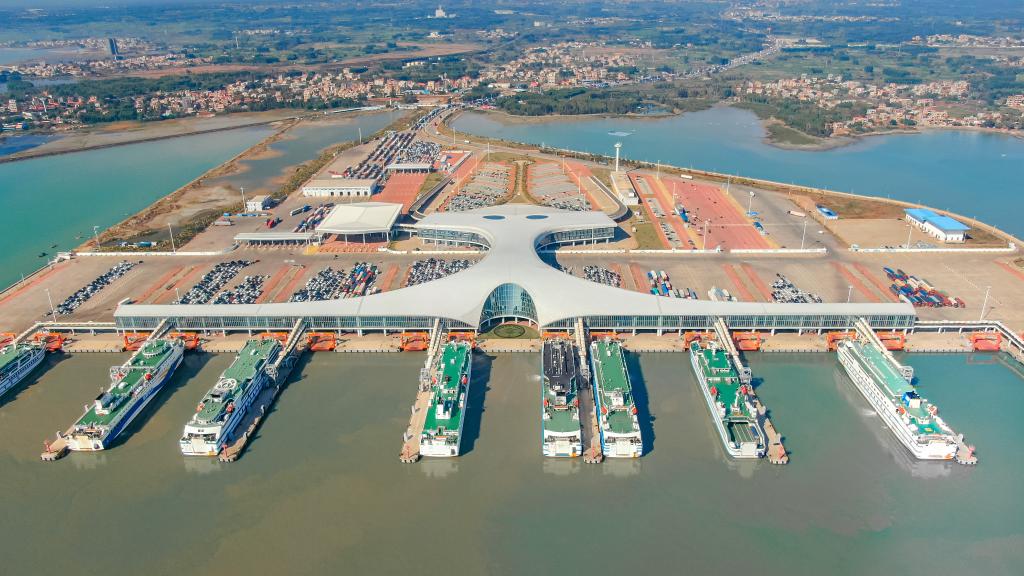 圖為徐聞港“得月門”,建筑呈凹陷半月狀,取“近水樓臺先得月”之意。 作為瓊州海峽北岸主要的客滾運(yùn)輸港口,徐聞港有16個(gè)萬噸級客貨滾裝泊位和1個(gè)萬噸級專用泊位,設(shè)計(jì)年吞吐能力為大貨車、小轎車等車輛320萬輛次,旅客1728萬人次。 如今每年有超過1200萬人次旅客通過徐聞港進(jìn)出海南島。徐聞港日常平均15分鐘到30分鐘就有一個(gè)航班,單日最高航班數(shù)達(dá)196個(gè)。 開港以來,徐聞港車輛、旅客、貨物吞吐量穩(wěn)中有升。僅2023年春運(yùn)期間,徐聞港大貨車、小轎車等車輛吞吐量達(dá)69萬輛,旅客吞吐量達(dá)244萬人次,貨物吞吐量達(dá)1060萬噸。