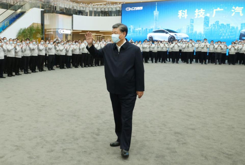 2023年4月12日,習(xí)近平在廣東廣汽研究院向職工們揮手致意。