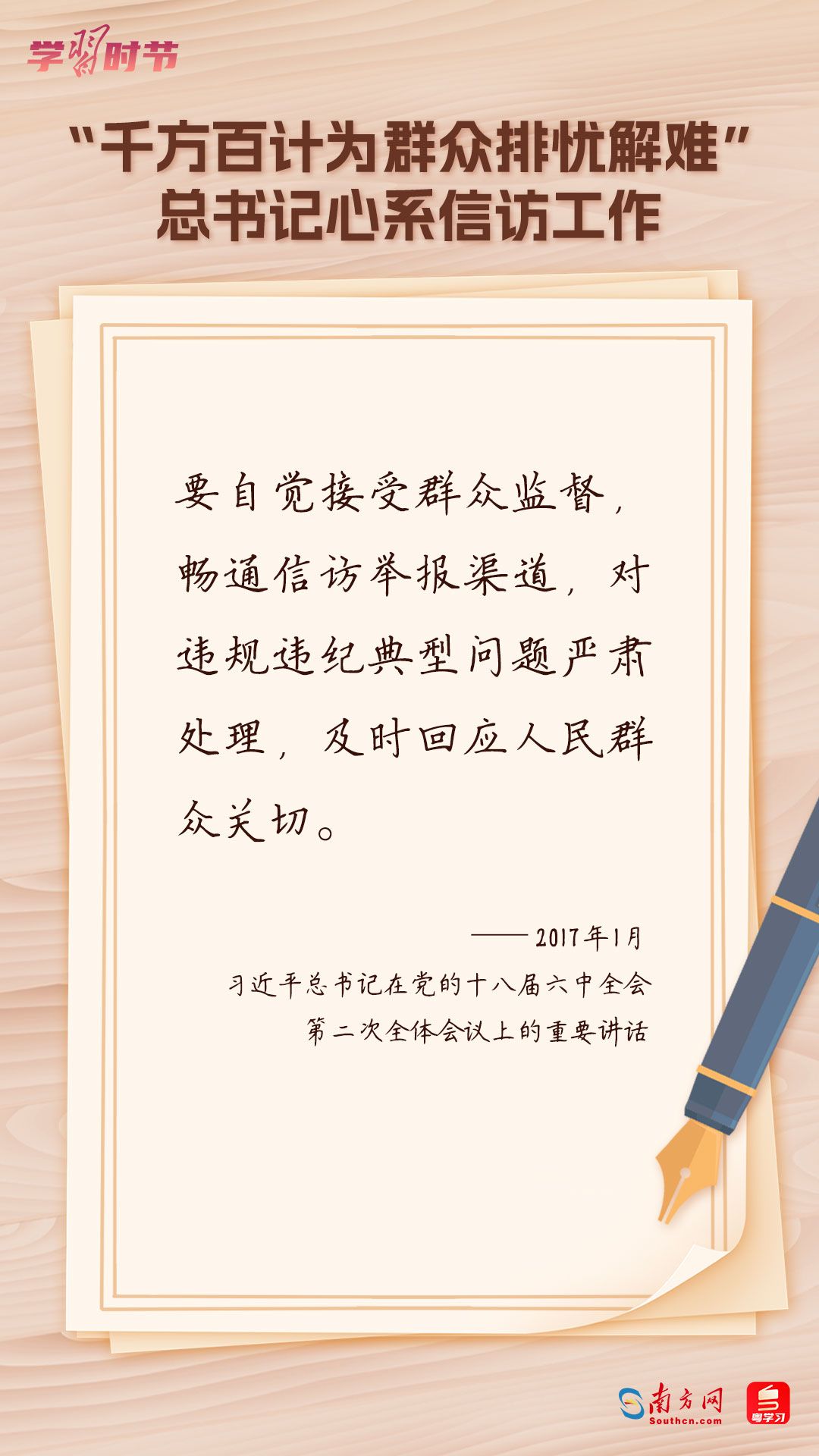 學(xué)習(xí)時(shí)節(jié)|“千方百計(jì)為群眾排憂解難”,總書(shū)記心系信訪工作信訪工作是黨的群眾工作的重要組成部分,是了解社情民意的重要窗口。黨的十八大以來(lái),以習(xí)近平同志為核心的黨中央對(duì)信訪工作作出一系列重要決策部署,開(kāi)創(chuàng)了新時(shí)代信訪工作新局面。 2022年5月1日,中共中央、國(guó)務(wù)院印發(fā)的《信訪工作條例》正式實(shí)施!缎旁L工作條例》以習(xí)近平新時(shí)代中國(guó)特色社會(huì)主義思想為指導(dǎo),深入貫徹習(xí)近平總書(shū)記關(guān)于加強(qiáng)和改進(jìn)人民信訪工作的重要思想,總結(jié)黨長(zhǎng)期以來(lái)領(lǐng)導(dǎo)和開(kāi)展信訪工作經(jīng)驗(yàn)特別是黨的十八大以來(lái)信訪工作制度改革成果,堅(jiān)持和加強(qiáng)黨對(duì)信訪工作的全面領(lǐng)導(dǎo),理順信訪工作體制機(jī)制,是新時(shí)代信訪工作的基本遵循。今年5月1日是《信訪工作條例》實(shí)施一周年,“學(xué)習(xí)時(shí)節(jié)”整理摘錄習(xí)近平總書(shū)記關(guān)于信訪工作的重要講話和重要指示批示,與您一同學(xué)習(xí)。