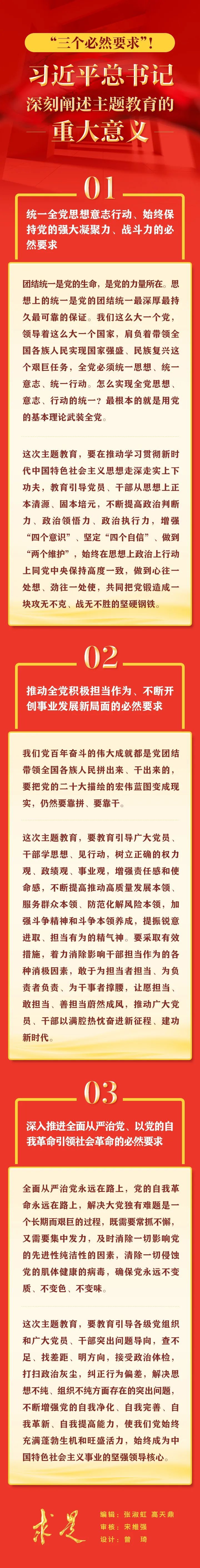“三個必然要求”! 習近平總書記深刻闡述主題教育的重大意義“以縣處級以上領導干部為重點在全黨深入開展學習貫徹新時代中國特色社會主義思想主題教育,是貫徹落實黨的二十大精神的重大舉措,對于統(tǒng)一全黨思想、解決黨內存在的突出問題、始終保持黨同人民群眾血肉聯(lián)系、推動黨和國家事業(yè)發(fā)展,具有重要意義! 5月1日出版的第9期《求是》雜志刊發(fā)習近平總書記重要文章《在學習貫徹習近平新時代中國特色社會主義思想主題教育工作會議上的講話》。在這篇重要文章中,習近平總書記用“三個必然要求”深刻闡述開展這次主題教育的重大意義。