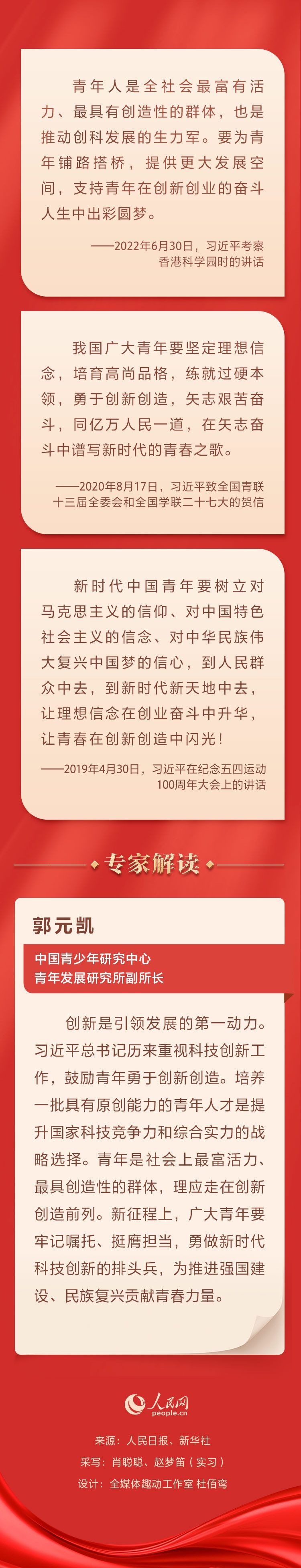 激揚(yáng)青春|“讓青春在創(chuàng)新創(chuàng)造中閃光!” 習(xí)近平寄語(yǔ)青年“青年是祖國(guó)的前途、民族的希望、創(chuàng)新的未來(lái)!币恢币詠(lái),中共中央總書(shū)記、國(guó)家主席、中央軍委主席習(xí)近平鼓勵(lì)青年追求夢(mèng)想,讓青春在創(chuàng)新創(chuàng)造中閃光。人民網(wǎng)邀請(qǐng)專(zhuān)家進(jìn)行解讀。
