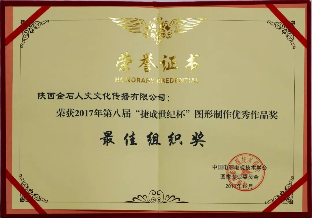 陜西金石人文文化傳播有限公司榮獲2017年第八屆“捷成世界杯”圖形制作優(yōu)秀作品獎(jiǎng)最佳組織獎(jiǎng)。 中國(guó)電影電視技術(shù)學(xué)會(huì)圖像專(zhuān)業(yè)委員會(huì)成立于1982年3月,主要由全國(guó)各省市電視臺(tái)、知名視頻網(wǎng)站、主流設(shè)備廠商、影視相關(guān)院校、影視制作公司等相關(guān)視頻制作、圖形設(shè)計(jì)的專(zhuān)家學(xué)者組成,在中國(guó)電影電視技術(shù)學(xué)會(huì)的領(lǐng)導(dǎo)下開(kāi)展各項(xiàng)學(xué)術(shù)活動(dòng),是影視行業(yè)內(nèi)知名的圖像學(xué)術(shù)團(tuán)體。