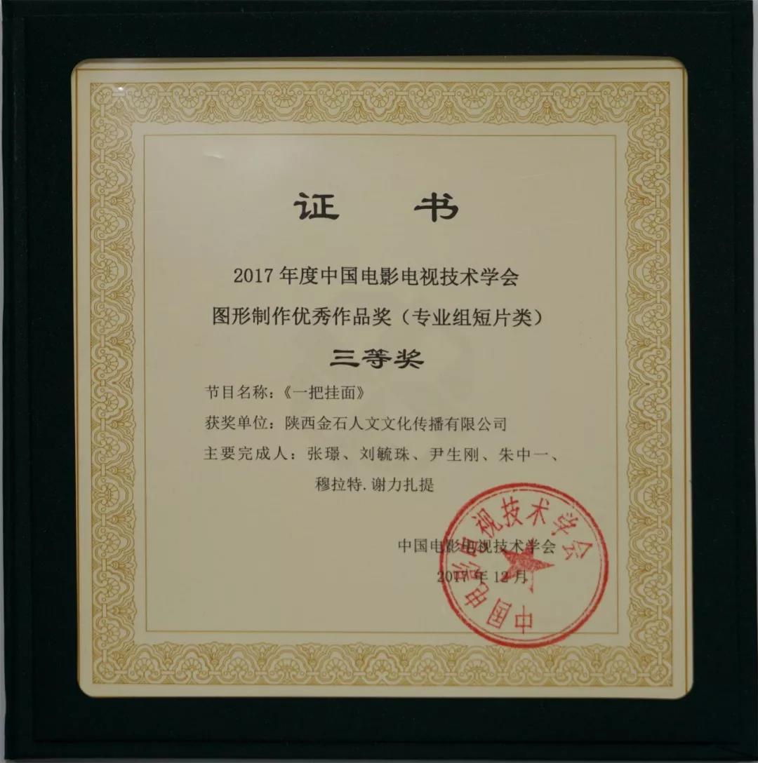 由中共吳堡縣委宣傳部、陜西金石人文文化傳播有限公司與陜西景浩澤影視有限責(zé)任公司聯(lián)合出品的電影《一把掛面》5分鐘預(yù)告片榮獲“2017年度中國(guó)電影電視技術(shù)學(xué)會(huì)圖形制作優(yōu)秀作品獎(jiǎng)(專(zhuān)業(yè)組短片類(lèi))三等獎(jiǎng)”。
