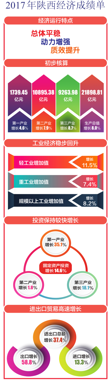 經(jīng)濟(jì)總量突破2萬(wàn)億元!站在新時(shí)代的起點(diǎn)上,陜西用實(shí)績(jī)?yōu)?017年經(jīng)濟(jì)發(fā)展畫(huà)上了圓滿的句號(hào)。 全年經(jīng)濟(jì)增速8.0%,投資繼續(xù)保持14%以上的快速增長(zhǎng),進(jìn)出口總額以37.4%的增速居全國(guó)第五位、西部第一位……在新時(shí)代的舞臺(tái)上,陜西發(fā)展底氣更足、實(shí)力更強(qiáng)、質(zhì)量更高。 陜西經(jīng)濟(jì)持續(xù)在合理區(qū)間運(yùn)行,呈現(xiàn)總體平穩(wěn)、動(dòng)力增強(qiáng)、質(zhì)效提升的良好態(tài)勢(shì)。這一年,陜西堅(jiān)持穩(wěn)中求進(jìn)工作總基調(diào),統(tǒng)籌推進(jìn)“五位一體”總體布局和協(xié)調(diào)推進(jìn)“四個(gè)全面”戰(zhàn)略布局;這一年,陜西緊盯追趕超越目標(biāo),踐行“五個(gè)扎實(shí)”要求;這一年,陜西認(rèn)真落實(shí)“五新”戰(zhàn)略任務(wù),推動(dòng)全省經(jīng)濟(jì)社會(huì)發(fā)展邁上了新臺(tái)階。 格局“穩(wěn)”—— 保持中高速增長(zhǎng) 全年走勢(shì)平穩(wěn) 縱觀2017年陜西全年經(jīng)濟(jì)走勢(shì),一季度經(jīng)濟(jì)增速8.1%,上半年8.2%,前三季度8.1%,全年8.0%,經(jīng)濟(jì)增速保持中高速,總體運(yùn)行平穩(wěn)。 平穩(wěn)之勢(shì)來(lái)之不易。2017年年初,我省工業(yè)經(jīng)濟(jì)面臨較大下行壓力,工業(yè)投資低位徘徊,能源工業(yè)和非能源工業(yè)表現(xiàn)欠佳,工業(yè)穩(wěn)增長(zhǎng)壓力較大,且這種壓力一直持續(xù)到了上半年;投資雖保持較快增長(zhǎng)態(tài)勢(shì),但新興產(chǎn)業(yè)投資回落,工業(yè)技改投資下降,對(duì)國(guó)民經(jīng)濟(jì)發(fā)展提供資金融通的金融業(yè)投資占比小,投資結(jié)構(gòu)需進(jìn)一步優(yōu)化;新舊動(dòng)能接續(xù)中,新業(yè)態(tài)新模式尚未成為支撐國(guó)民經(jīng)濟(jì)發(fā)展的主動(dòng)力……面對(duì)發(fā)展中的一系列不穩(wěn)定因素,省委、省政府堅(jiān)持新發(fā)展理念,堅(jiān)持高質(zhì)量發(fā)展,堅(jiān)持以供給側(cè)結(jié)構(gòu)性改革為主線,統(tǒng)籌推進(jìn)穩(wěn)增長(zhǎng)、促改革、調(diào)結(jié)構(gòu)、惠民生、防風(fēng)險(xiǎn)各項(xiàng)工作。 2017年4月,陜西出臺(tái)進(jìn)一步落實(shí)《工業(yè)穩(wěn)增長(zhǎng)促投資21條措施》的實(shí)施意見(jiàn),其總體思路是“穩(wěn)能源、促化工、興電子、強(qiáng)制造、擴(kuò)新興、優(yōu)傳統(tǒng)”。在這一措施推動(dòng)下,全省工業(yè)經(jīng)濟(jì)增長(zhǎng)放緩的不利局面得到扭轉(zhuǎn):上半年,全省工業(yè)投資增速在先進(jìn)裝備制造業(yè)、新能源和高新技術(shù)行業(yè)的帶動(dòng)下實(shí)現(xiàn)了由負(fù)轉(zhuǎn)正;前三季度,能源工業(yè)增速扭負(fù)為正,增加值增速由上年同期下降0.7%轉(zhuǎn)為增長(zhǎng)5.9%;2017年全年,全省規(guī)模以上工業(yè)增加值同比增長(zhǎng)8.2%,較上年加快1.3個(gè)百分點(diǎn)。 2017年是推進(jìn)供給側(cè)結(jié)構(gòu)性改革的深化之年。這一年,陜煤集團(tuán)優(yōu)質(zhì)煤炭占比達(dá)95%,全年實(shí)現(xiàn)營(yíng)業(yè)收入2600億元,同比增長(zhǎng)22.6%,實(shí)現(xiàn)利潤(rùn)105億元,同比增盈75億元,利潤(rùn)總額位居省屬國(guó)企之首。同時(shí),該集團(tuán)新增核準(zhǔn)6個(gè)優(yōu)質(zhì)礦井項(xiàng)目,產(chǎn)能規(guī)模達(dá)5620萬(wàn)噸,已投產(chǎn)產(chǎn)能3420萬(wàn)噸,項(xiàng)目數(shù)量和產(chǎn)能規(guī)模居全國(guó)第一位。陜煤集團(tuán)的發(fā)展是陜西穩(wěn)步推進(jìn)供給側(cè)結(jié)構(gòu)性改革、振興實(shí)體經(jīng)濟(jì)的縮影。2017年,供給側(cè)結(jié)構(gòu)性改革在全省各領(lǐng)域深入推進(jìn),碩果累累:減輕企業(yè)稅費(fèi)負(fù)擔(dān),全年全省累計(jì)減免稅收400億元左右;房地產(chǎn)庫(kù)存和企業(yè)金融杠桿率不斷降低;煤炭、鋼鐵產(chǎn)量穩(wěn)中有升,省內(nèi)煤炭企業(yè)利潤(rùn)創(chuàng)歷史最好水平;生產(chǎn)要素不斷向?qū)嶓w經(jīng)濟(jì)聚集,筑牢穩(wěn)發(fā)展的根基…… 穩(wěn)增長(zhǎng)的結(jié)果還在全年經(jīng)濟(jì)數(shù)據(jù)上得以呈現(xiàn):農(nóng)業(yè)穩(wěn),糧食生產(chǎn)連續(xù)14年超過(guò)千萬(wàn)噸;工業(yè)生產(chǎn)穩(wěn)定,去年規(guī)模以上工業(yè)增加值增速已連續(xù)8個(gè)月保持在7.5%以上;服務(wù)業(yè)穩(wěn)定發(fā)展,占GDP比重穩(wěn)定在40%以上。 動(dòng)力“強(qiáng)”—— 新動(dòng)能加速成長(zhǎng) 新優(yōu)勢(shì)不斷積聚 經(jīng)濟(jì)增長(zhǎng)的動(dòng)力從哪里來(lái)?從改革中來(lái),從調(diào)整中來(lái),從創(chuàng)新中來(lái)。2017年,在一系列改革創(chuàng)新政策措施的帶動(dòng)下,我省新舊動(dòng)能加速轉(zhuǎn)換,新經(jīng)濟(jì)、新動(dòng)能加快成長(zhǎng),經(jīng)濟(jì)發(fā)展活力、潛力持續(xù)釋放,發(fā)展的動(dòng)力不斷增強(qiáng),發(fā)展的優(yōu)勢(shì)不斷積聚。 以改革為動(dòng)力,我省深入推進(jìn)“放管服”改革。于2017年4月1日掛牌的中國(guó)(陜西)自由貿(mào)易試驗(yàn)區(qū),市場(chǎng)準(zhǔn)入環(huán)節(jié)實(shí)現(xiàn)“一口受理、并聯(lián)審批、多證合一、多項(xiàng)聯(lián)辦”,企業(yè)注冊(cè)