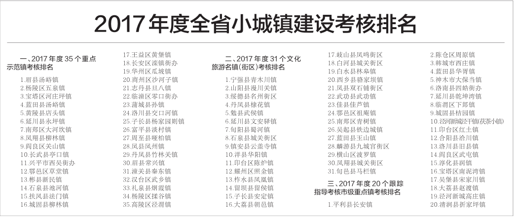 陜西:重點示范鎮(zhèn)和文化旅游名鎮(zhèn)每鎮(zhèn)獎勵100萬元加快特色小城鎮(zhèn)建設,是省委、省政府推進城鄉(xiāng)融合發(fā)展、實施鄉(xiāng)村振興戰(zhàn)略的重要舉措。2017年,全省重點示范鎮(zhèn)、文化旅游名鎮(zhèn)(街區(qū))和省上跟蹤指導考核的市級重點鎮(zhèn),圍繞規(guī)劃提升、人口聚集、產業(yè)發(fā)展、脫貧攻堅、擴權強鎮(zhèn)等目標狠抓落實,投資任務超額完成,產鎮(zhèn)融合提質增效,人文特色持續(xù)彰顯,生態(tài)環(huán)境明顯改善,各項建設取得顯著成效,帶動了全省小城鎮(zhèn)發(fā)展。 經綜合考核,省政府通報表彰眉縣湯峪鎮(zhèn)、楊陵區(qū)五泉鎮(zhèn)、寶塔區(qū)河莊坪鎮(zhèn)、藍田縣湯峪鎮(zhèn)、黃陵縣店頭鎮(zhèn)、延川縣永坪鎮(zhèn)、南鄭區(qū)大河坎鎮(zhèn)、鳳翔縣柳林鎮(zhèn)、閻良區(qū)關山鎮(zhèn)、長武縣亭口鎮(zhèn)等10個鎮(zhèn)為2017年度省級重點示范鎮(zhèn)建設先進鎮(zhèn);寧強縣青木川鎮(zhèn)、山陽縣漫川關鎮(zhèn)、綏德縣名州街區(qū)、丹鳳縣棣花鎮(zhèn)、勉縣武侯鎮(zhèn)、延川縣文安驛鎮(zhèn)、旬陽縣蜀河鎮(zhèn)、石泉縣城關街區(qū)、鎮(zhèn)安縣云蓋寺鎮(zhèn)、洋縣華陽鎮(zhèn)等10個鎮(zhèn)(街區(qū))為2017年度文化旅游名鎮(zhèn)(街區(qū))建設先進鎮(zhèn)(街區(qū));平利縣長安鎮(zhèn)、陳倉區(qū)周原鎮(zhèn)、韓城市西莊鎮(zhèn)、藍田縣華胥鎮(zhèn)、神木市大保當鎮(zhèn)、洛南縣四皓街辦、延川縣乾坤灣鎮(zhèn)、臨渭區(qū)下邽鎮(zhèn)、城固縣桔園鎮(zhèn)、涇河新城涇干鎮(zhèn)(茯茶小鎮(zhèn))等10個鎮(zhèn)為2017年度市級重點鎮(zhèn)建設先進鎮(zhèn)。 按照相關規(guī)定,對評選出的10個重點示范鎮(zhèn)和10個文化旅游名鎮(zhèn)(街區(qū))建設先進鎮(zhèn),每個鎮(zhèn)獎勵100萬元;對評選出的10個市級重點鎮(zhèn)建設先進鎮(zhèn),采取“以獎代補”方式一次性獎勵每個鎮(zhèn)600萬元專項資金和600畝城鄉(xiāng)建設增減掛鉤用地指標、新增建設用地指標。(記者 ;ǎ
