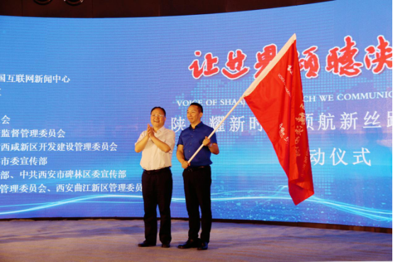 中共陜西省委網(wǎng)信辦主任鮑永能向采訪團(tuán)代表授旗 會(huì)上,鮑永能鄭重地將一面印有“讓世界傾聽(tīng)陜西聲音”的采訪團(tuán)團(tuán)旗遞交到采訪團(tuán)代表、中國(guó)網(wǎng)絲路中國(guó)頻道總監(jiān)楊志春手中,完成了重要的交接與囑托。