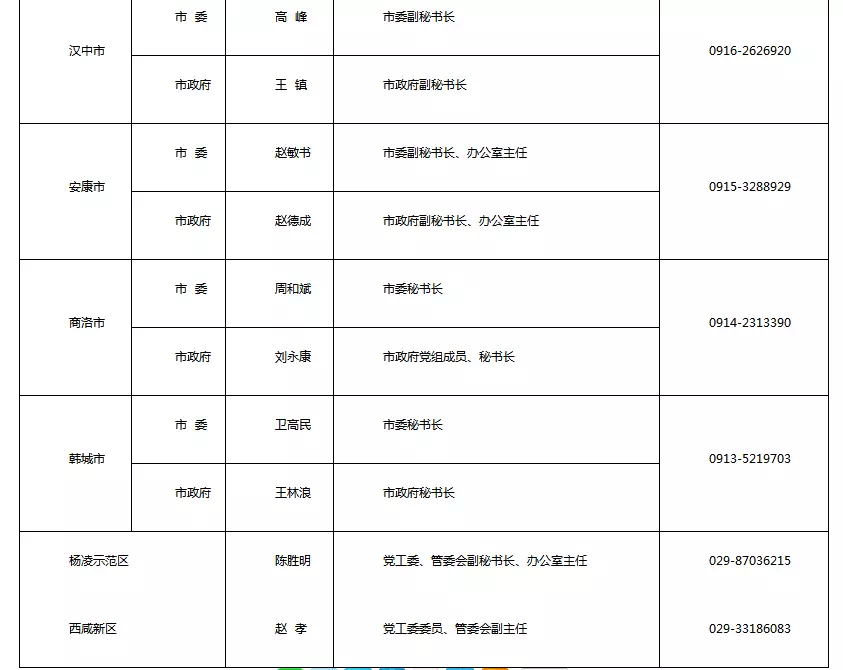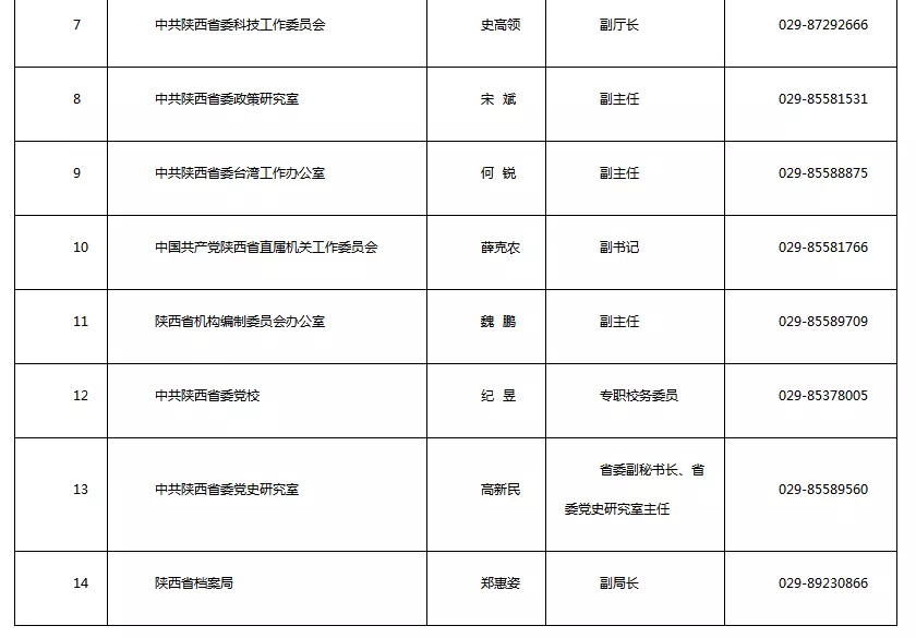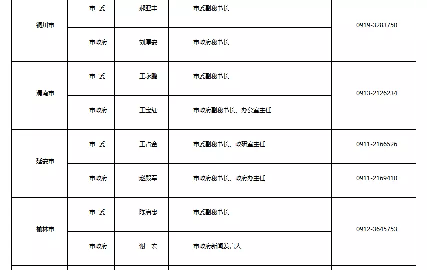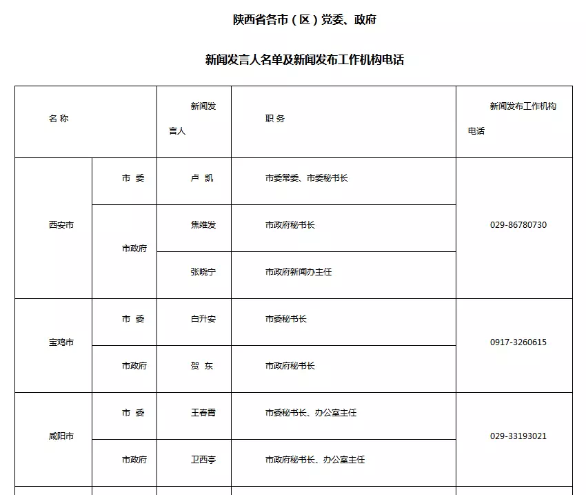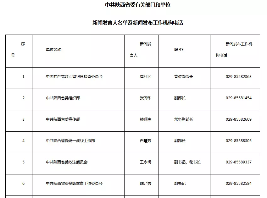 陜西省公布2018年新聞發(fā)言人及工作機(jī)構(gòu)電話近期,我省部分市(區(qū))黨委政府和省委省政府及相關(guān)部門新聞發(fā)言人進(jìn)行了調(diào)整。 為便于各新聞單位和社會公眾的溝通聯(lián)系,及時回應(yīng)社會關(guān)切,中共陜西省委對外宣傳辦公室將更新后的新聞發(fā)言人名單和新聞發(fā)布工作機(jī)構(gòu)聯(lián)系電話予以公布。