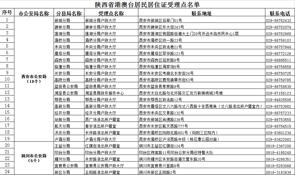 陜西省設(shè)立127個港澳臺居民居住證辦理受理點8月30日,陜西省公安廳治安管理局正式向社會公布全省127個港澳臺居民居住證申請辦理受理點。9月1日起,在陜港澳臺居民均可就近申請辦理居住證。 國務(wù)院辦公廳印發(fā)《港澳臺居民居住證申領(lǐng)發(fā)放辦法》將于今年9月1日正式實施。今后持證的港澳臺居民可在居住地享受勞動就業(yè)、參加社會保險、依法繳存提取和使用住房公積金3項權(quán)利,義務(wù)教育、就業(yè)、衛(wèi)生、文化等6項基本公共服務(wù),以及涉及諸多方面的9項便利。 經(jīng)研究,省公安廳決定在全省設(shè)立127個受理點,其中每個縣區(qū)至少有一個,方便港澳臺居民就近辦理。凡符合申領(lǐng)條件的港澳臺同胞可攜帶有效證件和相關(guān)材料,就近申請辦理居住證,20個工作日即可領(lǐng)取證件。(具體申領(lǐng)條件及辦法請參閱《港澳臺居民居住證申領(lǐng)發(fā)放辦法》) 全省受理點名單如下: