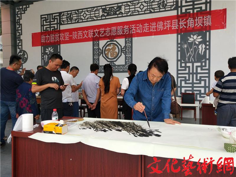 9月3日至5日,由陜西省文聯(lián)主辦、陜西省青年書法家協(xié)會承辦、佛坪縣長角壩鎮(zhèn)協(xié)辦的“助力脫貧攻堅——陜西文聯(lián)文藝志愿服務(wù)活動”在佛坪縣沙窩村舉行。近二十位書畫藝術(shù)家走進(jìn)佛坪縣長角壩鎮(zhèn)沙窩村,與當(dāng)?shù)匕傩胀酝,體驗生活。 長角壩鎮(zhèn)沙窩村是陜西省文聯(lián)的包扶村,陜西省文聯(lián)秘書長劉平安在這里擔(dān)任第一書記。該地位于秦嶺腹地,林木蔥蘢、景色秀麗,被評為省級鄉(xiāng)村旅游示范村、市級美麗鄉(xiāng)村建設(shè)示范村。這里不僅保持著良好的生態(tài)環(huán)境,而且蘊含著深厚的歷史文化資源,至今保留著紅二十五軍長征舊址和建于唐代的復(fù)興寺。 隨著脫貧攻堅工作的開展及新農(nóng)村建設(shè),該村建起了服務(wù)中心,很多家庭辦起了農(nóng)家樂,日子越來越紅火,對于文化生活的追求也越來越高。志愿服務(wù)隊伍一行先后參觀了沙窩村服務(wù)中心、冷水魚養(yǎng)殖場,并赴紅二十五軍舊址開展革命教育。在活動現(xiàn)場藝術(shù)家們滿懷激情,揮毫潑墨,義務(wù)為沙窩村村民創(chuàng)作書畫作品200余幅。村民們爭先恐后讓藝術(shù)家們?yōu)樽约肄r(nóng)家樂或家中題字,藝術(shù)家們也是有求必應(yīng),為老百姓們送上自己的祝福;顒悠陂g,中國書協(xié)理事、陜西省書協(xié)常務(wù)副主席、省青書協(xié)主席張紅春還應(yīng)邀為長角壩鎮(zhèn)小學(xué)的孩子們普及書法知識,進(jìn)行書法啟蒙,受到孩子們的熱烈歡迎。