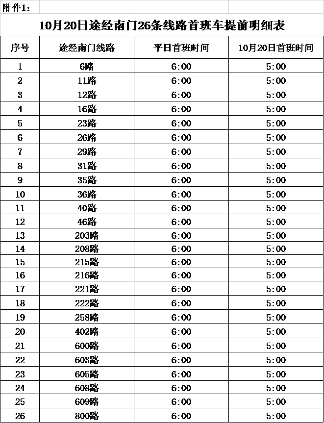 10月20日途經(jīng)南門26條線路首班車提前明細(xì)表