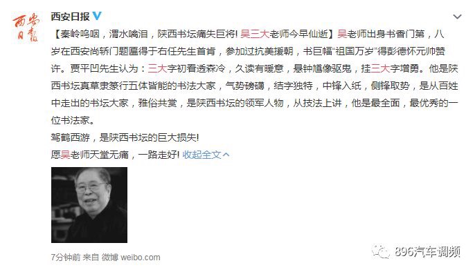 據(jù)@西安日報(bào) 微博消息:秦嶺嗚咽,渭水噙淚,陜西書壇痛失巨將!吳三大老師今早仙逝。 吳老師出身書香門第,八歲在西安尚轎門題匾得于右任先生首肯,參加過抗美援朝,書巨幅“祖國萬歲”得彭德懷元帥贊許。賈平凹先生認(rèn)為:三大字初看透森冷,久讀有暖意,懸鐘馗像驅(qū)鬼,掛三大字增勇。他是陜西書壇真草隸篆行五體皆能的書法大家,氣勢磅礴,結(jié)字獨(dú)特,中鋒入紙,側(cè)鋒取勢,是從百姓中走出的書壇大家,雅俗共賞,是陜西書壇的領(lǐng)軍人物,從技法上講,他是最全面,最優(yōu)秀的一位書法家。