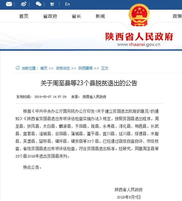 陜西傳媒網(wǎng)訊(記者 王海濤 程偉)5月7日,陜西省人民政府門戶網(wǎng)站發(fā)布公告,2018年陜西省共有23個貧困縣退出貧困縣序列。至此陜西已累計有27個貧困縣實現(xiàn)脫貧摘帽。這也標(biāo)志著延安、西安、寶雞、咸陽4個市率先在全省實現(xiàn)所有貧困縣脫貧摘帽。