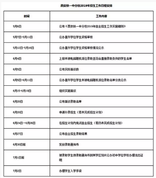 電腦隨機(jī)派位工作由西安市碑林區(qū)教育局于2019年6月3日具體組織實(shí)施。學(xué)校將在學(xué)校網(wǎng)站公布經(jīng)市、區(qū)教育局審核備案后的電腦隨機(jī)派位結(jié)果。6月4日,學(xué)校將未被電腦隨機(jī)派位錄取且符合直接錄取條件的學(xué)生花名冊(cè)報(bào)西安市碑林區(qū)教育局審核,6月5日-6月11日通過(guò)學(xué)校官網(wǎng)分類進(jìn)行公示。 面談時(shí)間:2019年6月15日-6月19日(具體日期、時(shí)間以面談憑證所載信息為準(zhǔn))。 面談地點(diǎn):西安鐵一中分校(西安市雁塔區(qū)青龍北路8號(hào))。 公布結(jié)果:6月20日12:00前,按照西安市碑林區(qū)教育局的統(tǒng)一要求,在學(xué)校官網(wǎng)進(jìn)行公布。 補(bǔ)錄 “電腦隨機(jī)派位+面談”工作結(jié)束后若有剩余招生計(jì)劃則實(shí)施補(bǔ)錄。補(bǔ)錄按照《西安市碑林區(qū)教育局2019年民辦學(xué)校初中招生剩余招生計(jì)劃補(bǔ)錄工作實(shí)施辦法》進(jìn)行。 陜西師大附中分校 該校將于6月3日進(jìn)行電腦隨機(jī)派位,6月15日至6月19日進(jìn)行面談。 電腦隨機(jī)派位的時(shí)間及地點(diǎn):6月3日10:00,電腦隨機(jī)派位由區(qū)教育局在轄區(qū)同一地點(diǎn)集中進(jìn)行,統(tǒng)一使用西安市民辦學(xué)校初中電腦隨機(jī)派位系統(tǒng)。 面談前期準(zhǔn)備 6月5日前,學(xué)校將根據(jù)預(yù)估面談申請(qǐng)人數(shù)科學(xué)設(shè)定面談場(chǎng)次,合理設(shè)置面談室,按規(guī)定向雁塔區(qū)教育局報(bào)送面談日期安排、場(chǎng)次時(shí)間安排、面談室數(shù)量等信息。 根據(jù)前期我校與有關(guān)單位簽訂的協(xié)議,該校須解決長(zhǎng)慶坊璽岸業(yè)主子女及長(zhǎng)慶石油勘探局(西儀綜合服務(wù)處)職工子女入學(xué),通過(guò)資格審查的長(zhǎng)慶坊璽岸業(yè)主子女及長(zhǎng)慶石油勘探局(西儀綜合服務(wù)處)職工子女,均須參加電腦隨機(jī)派位,未被電腦隨機(jī)派位錄取的,經(jīng)公示無(wú)異議后直接錄取,不再參加面談。 學(xué)校于5月7日至11日對(duì)這部分學(xué)生基本信息及相關(guān)佐證材料嚴(yán)格審核;5月12日至5月16日公示長(zhǎng)慶坊璽岸業(yè)主子女及長(zhǎng)慶石油勘探局(西儀綜合服務(wù)處)職工子女名單,公示結(jié)束后將校長(zhǎng)簽字、加蓋學(xué)校公章的長(zhǎng)慶坊璽岸業(yè)主子女及長(zhǎng)慶石油勘探局(西儀綜合服務(wù)處)職工子女名單及有效支撐材料報(bào)區(qū)教育局核準(zhǔn)。 6月4日,學(xué)校將未被電腦隨機(jī)派位錄取的長(zhǎng)慶坊璽岸業(yè)主子女及長(zhǎng)慶石油勘探局(西儀綜合服務(wù)處)職工子女花名冊(cè),由校長(zhǎng)簽字并加蓋學(xué)校公章后報(bào)區(qū)教育局審核。學(xué)校于6月5日通過(guò)學(xué)校官網(wǎng)公布本校未被電腦隨機(jī)派位錄取的長(zhǎng)慶坊璽岸業(yè)主子女及長(zhǎng)慶石油勘探局(西儀綜合服務(wù)處)職工子女名單、剩余面談?dòng)?jì)劃數(shù)。 面談實(shí)施過(guò)程 面談時(shí)間、地點(diǎn)及注意事項(xiàng) 面談統(tǒng)一于6月15日——6月19日在陜西師范大學(xué)附屬中學(xué)分校(西安市緯一街中段)舉行。具體日期、時(shí)間以面談憑證所載信息為準(zhǔn)。參加面談的學(xué)生禁止攜帶手機(jī)。 錄取后的相關(guān)工作 1、通過(guò)電腦隨機(jī)派位或面談方式被我校錄取的學(xué)生,請(qǐng)各位家長(zhǎng)于6月30日前上午9:00來(lái)該校領(lǐng)取錄取通知書。 2、7月1日前,學(xué)生持我校的錄取通知書到為其學(xué)區(qū)劃片公辦初中學(xué)校辦理流出證明。 3、7月2日上午9:00,請(qǐng)各位家長(zhǎng)持錄取通知書到我校辦理入學(xué)手續(xù)。 4、長(zhǎng)慶坊璽岸業(yè)主子女及長(zhǎng)慶石油勘探局(西儀綜合服務(wù)處)職工子女在西安市義務(wù)教育招生入學(xué)管理平臺(tái)或微信公眾號(hào)中未申報(bào)我校者,我校將不予錄取。 西安高新一中初中校區(qū) 6月3日進(jìn)行電腦隨機(jī)派位,6月15日至19日進(jìn)行面談。 5月19日12:00,在學(xué)校官網(wǎng)公布由資格審核組審核通過(guò)的高新區(qū)原政策規(guī)定業(yè)主子女人數(shù),并上報(bào)審核通過(guò)學(xué)生基本信息至高新區(qū)教育局備案。 5月20日8:00 ~ 5月31日18:00,資格審查及網(wǎng)上報(bào)名。網(wǎng)上報(bào)名結(jié)束后,不再接受報(bào)名登記。 學(xué)校電腦隨機(jī)派位工作由高新區(qū)教育局6月3日10:00在轄區(qū)同一地點(diǎn)集中進(jìn)行。 面談時(shí)間與地點(diǎn) 面談?dòng)?strong>6月15日~19日在西安高新一中初中校區(qū)(西安市高新開發(fā)區(qū)高新路62號(hào))舉行。具體時(shí)間、地點(diǎn)以面談憑證所載信息為準(zhǔn)。 面談對(duì)象 1.根據(jù)高新區(qū)教育局的招生方案,由高新區(qū)教育局領(lǐng)導(dǎo)下的資格審核組負(fù)責(zé)通過(guò)資格審查的,原政策規(guī)定的業(yè)主子女,必須參加電腦隨機(jī)派位。未被電腦隨機(jī)派位錄取的原政策規(guī)定的業(yè)主子女,經(jīng)6月12日18:00 ~ 6月16日18:00在校園網(wǎng)上公示無(wú)異議后,不再參加面談,直接錄取。 2.未被錄取又愿意承擔(dān)民辦學(xué)校學(xué)費(fèi),自愿參加本校面談的學(xué)生,應(yīng)二次登錄西安市義務(wù)教育