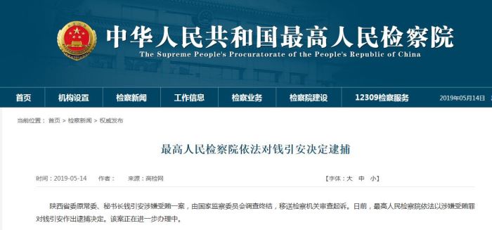 最高人民檢察院依法對(duì)錢引安做出逮捕決定人民網(wǎng)西安5月14日電(谷妍) 據(jù)高檢網(wǎng)消息:陜西省委原常委、秘書長(zhǎng)錢引安涉嫌受賄一案,由國(guó)家監(jiān)察委員會(huì)調(diào)查終結(jié),移送檢察機(jī)關(guān)審查起訴。日前,最高人民檢察院依法以涉嫌受賄罪對(duì)錢引安作出逮捕決定。該案正在進(jìn)一步辦理中。