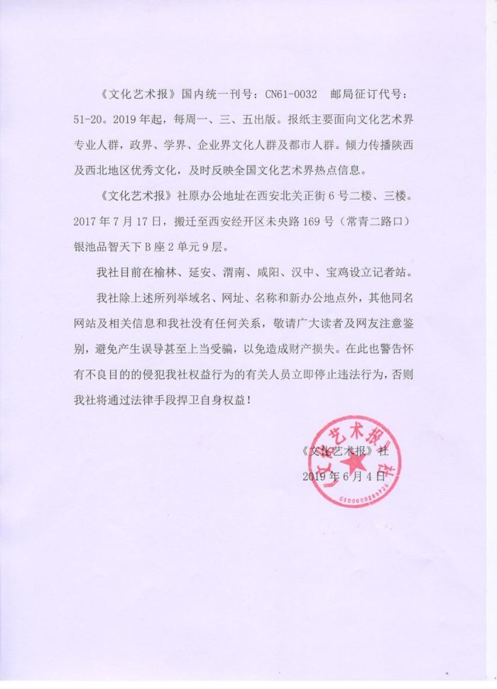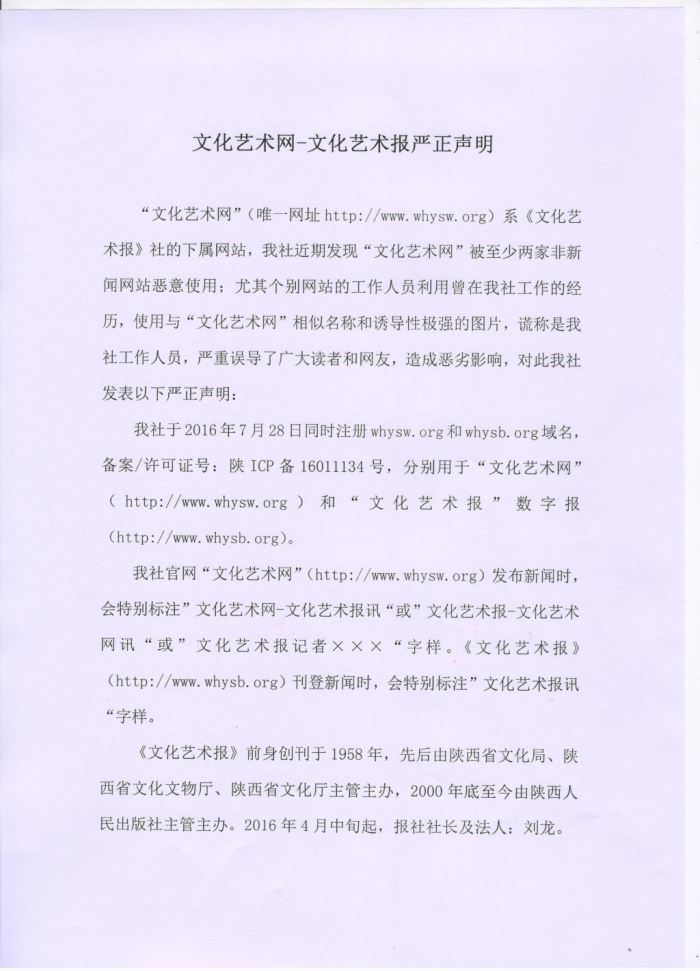文化藝術(shù)網(wǎng)-文化藝術(shù)報嚴正聲明“文化藝術(shù)網(wǎng)”(唯一網(wǎng)址http://www.www.c710.com)系《文化藝術(shù)報》社的下屬網(wǎng)站,我社近期發(fā)現(xiàn)“文化藝術(shù)網(wǎng)”被至少兩家非新聞網(wǎng)站惡意使用;尤其個別網(wǎng)站的工作人員利用曾在我社工作的經(jīng)歷,使用與“文化藝術(shù)網(wǎng)”相似名稱和誘導(dǎo)性極強的圖片,謊稱是我社工作人員,嚴重誤導(dǎo)了廣大讀者和網(wǎng)友,造成惡劣影響,對此我社發(fā)表以下嚴正聲明: 我社于2016年7月28日同時注冊www.c710.com和whysb.org域名,備案/許可證號:陜ICP備16011134號,分別用于“文化藝術(shù)網(wǎng)”(http://www.www.c710.com)和“文化藝術(shù)報”數(shù)字報(http://www.whysb.org)。 我社官網(wǎng)“文化藝術(shù)網(wǎng)”(http://www.www.c710.com)發(fā)布新聞時,會特別標注“文化藝術(shù)網(wǎng)-文化藝術(shù)報訊”或“文化藝術(shù)報-文化藝術(shù)網(wǎng)訊”或“文化藝術(shù)報記者×××”字樣!段幕囆g(shù)報》(http://www.whysb.org)刊登新聞時,會特別標注“文化藝術(shù)報訊”字樣。 《文化藝術(shù)報》前身創(chuàng)刊于1958年,先后由陜西省文化局、陜西省文化文物廳、陜西省文化廳主管主辦,2000年底至今由陜西人民出版社主管主辦。2016年4月中旬起,報社社長及法人:劉龍。 《文化藝術(shù)報》國內(nèi)統(tǒng)一刊號:CN61-0032 郵局征訂代號:51-20。2019年起,每周一、三、五出版。報紙主要面向文化藝術(shù)界專業(yè)人群,政界、學(xué)界、企業(yè)界文化人群及都市人群。傾力傳播陜西及西北地區(qū)優(yōu)秀文化,及時反映全國文化藝術(shù)界熱點信息。 《文化藝術(shù)報》社原辦公地址在西安北關(guān)正街6號二樓、三樓。2017年7月17日,搬遷至西安經(jīng)開區(qū)未央路169號(常青二路口)銀池品智天下B座2單元9層。 我社目前在榆林、延安、渭南、咸陽、漢中、寶雞設(shè)立記者站。 我社除上述所列舉域名、網(wǎng)址、名稱和新辦公地點外,其他同名網(wǎng)站及相關(guān)信息和我社沒有任何關(guān)系,敬請廣大讀者及網(wǎng)友注意鑒別,避免產(chǎn)生誤導(dǎo)甚至上當受騙,以免造成財產(chǎn)損失。在此也警告懷有不良目的的侵犯我社權(quán)益行為的有關(guān)人員立即停止違法行為,否則我社將通過法律手段捍衛(wèi)自身權(quán)益! 《文化藝術(shù)報》社 2019年6月4日