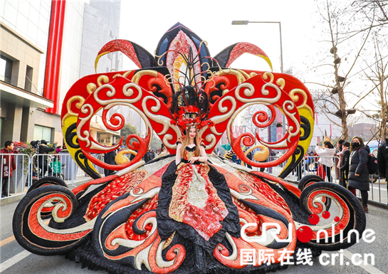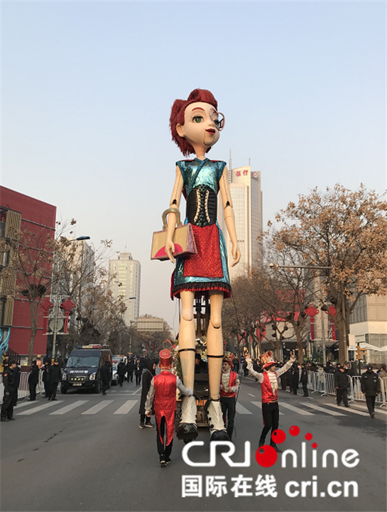 西安高新區(qū)跨年活動中花車巡游現(xiàn)場的巨人木偶蘿拉(攝影 陳嵐)