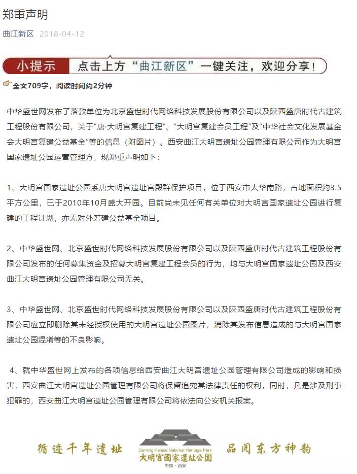 附錄1:曲江大明宮管理方2018年4月、2019年7月兩次“聲明”