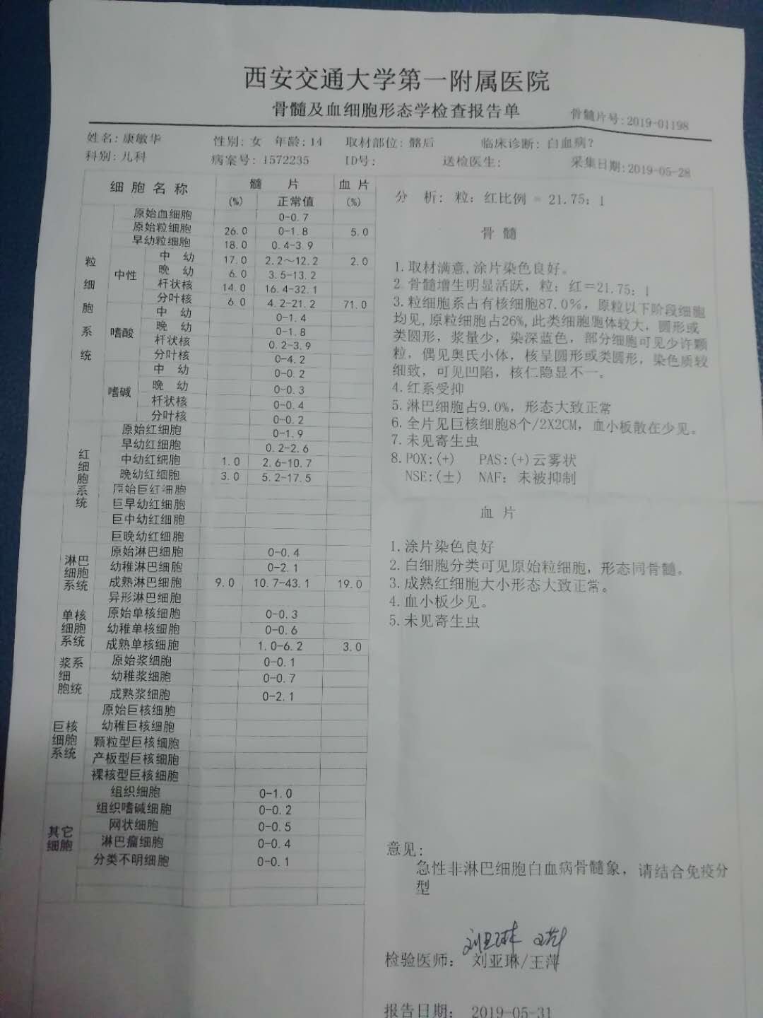 陜菜廚師康天恩: 救救我的女兒,她得了白血。文化藝術(shù)網(wǎng)-文化藝術(shù)報訊(記者 唐偉)從事陜西餐飲業(yè)二十多年,中國烹飪大師、中華金廚獎獲得者康天恩,這些天快被女兒的白血病擊垮了! 康天恩,家住陜西省三原縣西陽鎮(zhèn)康馬村四組。13歲的女兒康敏華是三原縣西陽鎮(zhèn)中學(xué)七年級一班的學(xué)生。 今年4月份開始,發(fā)現(xiàn)孩子貧血嚴重,兩腿發(fā)軟,就帶孩子到三原縣醫(yī)院,檢查說是重度貧血。醫(yī)生讓回家調(diào)理,過了幾天孩子又是渾身沒力氣。情急之下轉(zhuǎn)院到西安交大第一附屬醫(yī)院,在血液科做了活檢、骨穿,被確診為急性非淋巴細胞白血。