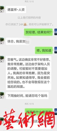 在接到德富祥的錄用通知后,徐先生便向原來(lái)單位提出離職并于5月22日辦理完相關(guān)手續(xù)回到西安。在此期間德富祥公司人資在電話溝通詢問(wèn)其是否可以提早入職,但因之前約定是5月23日?qǐng)?bào)到,因此徐先生未能提前到達(dá)德富祥公司報(bào)到。而是根據(jù)約定在5月23日帶齊了相關(guān)證件、照片等offer約定入職要求相關(guān)材料,與德富祥人資賀經(jīng)理對(duì)接。本以為一切如愿,但賀經(jīng)理告訴其還有一輪面試,于是經(jīng)過(guò)40多分鐘的面試之后,賀經(jīng)理告知徐先生讓其回家等消息。令人意外的是,5月24日德福祥人資賀經(jīng)理溝通告其因公司架構(gòu)調(diào)整不能增加人員。后來(lái),賀經(jīng)理因?yàn)閷?duì)于此事愧疚在微信里邀青徐先生吃飯,以表達(dá)歉意但被徐先生拒絕。 “這是嚴(yán)重的失信行為,德富祥作為一家在西安頗有影響的民營(yíng)企業(yè),竟如此不負(fù)責(zé)任,對(duì)于西安營(yíng)商環(huán)境是一種嚴(yán)重的挑釁!毙煜壬鷼鈶嵉卣f(shuō)。