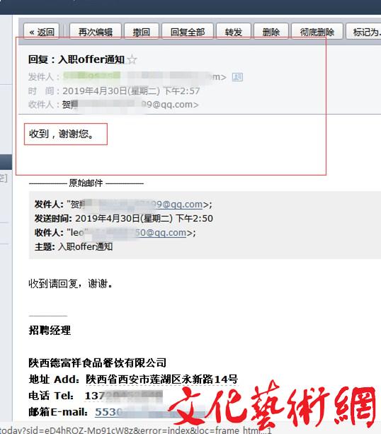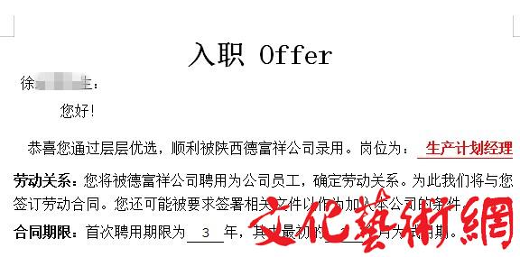 收到《錄用通知》后 卻被告知崗位取消 5月29日,記者接到家住西安的徐先生的投訴電話。他告訴記者,在今年3月28日至4月22日期間,先后四次參加陜西德富祥食品餐飲有限公司(以下簡(jiǎn)稱德富祥)的面試。其中最后一次的面試,也就是4月22日與該公司何姓經(jīng)理見面,面試溝通之后承諾給予錄用,最終于4月30日得到該公司人資賀經(jīng)理郵件發(fā)來(lái)的offer《錄用通知》,《通知書》中明確了徐先生將就職于德富祥公司生產(chǎn)計(jì)劃經(jīng)理一職,并約定于今年5月23日?qǐng)?bào)到。