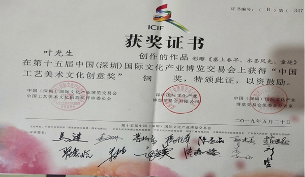 簽約儀式由榆林市文化產(chǎn)業(yè)聯(lián)合會會長陳亮主持,共簽約六家單位:榆林市委宣傳部副部長劉斌代表榆林市與深圳福田區(qū)文化創(chuàng)意產(chǎn)業(yè)協(xié)會、深圳蓮花山文學(xué)院、深圳崇德動漫股份有限公司簽約,榆林市張力文化產(chǎn)業(yè)工程有限公司與深圳市字在文化傳播有限公司簽約,榆林市順天企業(yè)管理有限公司與深圳市達(dá)達(dá)包裝設(shè)計(jì)有限公司簽約,榆林市信諾電子設(shè)備銷售有限公司與深圳市機(jī)大師科技有限公司簽約。 另外,在參與第十五屆中國(深圳)國際文化產(chǎn)業(yè)博覽交易會活動中,榆林市文化產(chǎn)業(yè)聯(lián)合會非物質(zhì)文化遺產(chǎn)聯(lián)盟成員取得傲人成績,分別是:萬軍利石雕《兒時(shí)-記憶》獲金獎,曹宏霞剪紙《媽媽的窗花花》獲銀獎,楊偉慧銀飾《蒙古族婦女銀質(zhì)頭飾》,張逍遙石雕《春耕、抱著兒子返鄉(xiāng)》,葉光生彩雕《塞上春早、水墨風(fēng)光、童趣》。