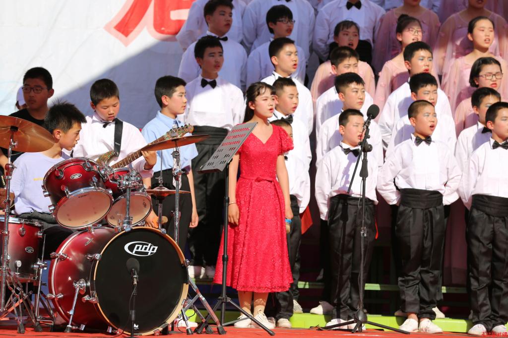 “太陽下去明早依舊爬上來……”本屆校園藝術(shù)節(jié)在七年級15、16班動感的《青春舞曲》中正式拉開帷幕。七年級的班歌大賽曲目由班歌加愛國主義歌曲,以兄弟班為組合,各班主任辛勤堅守,全力策劃,在音樂組老師們的耐心指導(dǎo)下,形成了各具特色的班級風(fēng)貌。 七年級5、6班的《太陽最紅,毛主席最親》和3、4班的《紅歌聯(lián)唱》將活動推向高潮。1、2班的《保衛(wèi)黃河》讓在場的所有觀眾激情澎湃,“保衛(wèi)家鄉(xiāng),保衛(wèi)黃河,保衛(wèi)華北,保衛(wèi)全中國!”“永定河,出西山,碧水環(huán)繞北京灣……中國人,意志堅,重整河山換新顏!”《盧溝謠》的旋律還在耳邊回蕩,7、8班的孩子們又讓我們看到了新時代的“七色夢”。