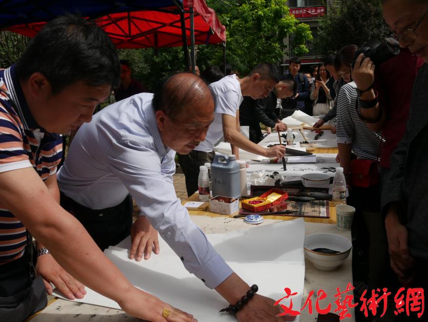 現(xiàn)場,書法家王慶與孫強向劉北社區(qū)贈送墨寶,并揮毫潑墨為社區(qū)居民書寫書法作品。