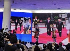 5月11日上午,在主賓國國家館開館儀式上,俄羅斯、柬埔寨用具有當(dāng)?shù)靥厣奈璧副硌,歡迎到訪的嘉賓。