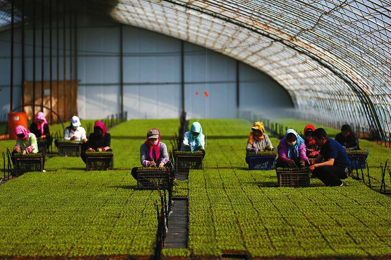 定邊縣繼旺果蔬冷藏有限公司育苗基地內(nèi),工人們正在進(jìn)行辣椒育苗工作。