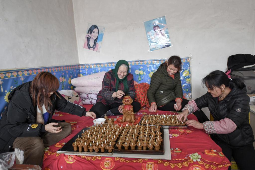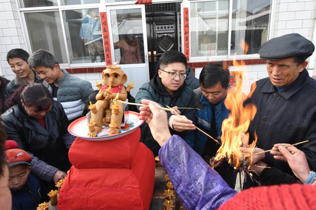 端燈是件繁瑣隆重而有熱鬧的事。制作過程不簡單。女兒一出嫁,就得在十五前,邀一位心靈手巧又有經(jīng)驗(yàn)的婦女來,先取出酒谷面,用溫水和好,做成窩窩頭樣,形如大饅頭,從底部到中間是空心的,一個(gè)一個(gè)擺好在籠里,搭在鍋里蒸。捏猴燈就是塑像,是門手藝活,得請一位藝術(shù)精湛經(jīng)驗(yàn)豐富的“捏塑藝人,用料面捏一只一尺來高的猴子,猴頭上捏一盞燈:一圈沿子,中間凹下去,插上燈蕊猴的兩肩各捏一盞;猴的兩手放在兩膝蓋上,掌心向上,兩手各端一盞捏好的小燈。猴的身旁依有幾只小猴,是猴子猴孫吧!它們也頭頂燈,手捧燈。新姑爺是猴燈的尊享者。親房鄰友的精干婦女也加入到忙碌的隊(duì)伍中,她們只捏小燈,大小如十二三孩子的拳頭般,圓形平底,上捏出沿子,沿邊用剪刀剪出各種花形,中間凹下去再插上燈蕊,小巧而玲瓏!燈的數(shù)量是有講究的,多少由新婚女兒的芳齡而定。一歲十二盞,如果新婚女兒今年二十三,那就得捏二百七十六盞。