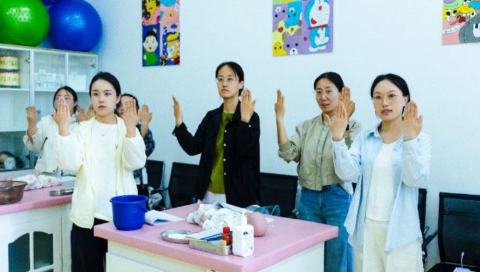 開班儀式后,神木市職業(yè)技術(shù)教育中心幼兒保育教師白建芳依次講授了《培訓(xùn)機(jī)構(gòu)設(shè)置標(biāo)準(zhǔn)(試行)和托育機(jī)構(gòu)管理規(guī)范》《托育機(jī)構(gòu)嬰幼兒早期發(fā)展與回應(yīng)性照護(hù)》《托育機(jī)構(gòu)嬰幼兒常見病預(yù)防與護(hù)理》等專業(yè)理論課程,音樂教師王彤鈺組織開展了韻律活動實操培訓(xùn)。 同日下午及4月27日上午,神木市職業(yè)技術(shù)教育中心幼兒護(hù)理教師張秀芳、音樂教師楊瑞,美術(shù)教師劉彩麗、張蒙分別對全體參訓(xùn)人員進(jìn)行了保育技能實操和兒童畫實操培訓(xùn),進(jìn)一步夯實了參訓(xùn)人員的動手操作能力。