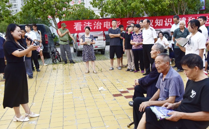 活動現(xiàn)場,縣司法局的干部向前來參加活動的居民們發(fā)放《中華人民共和國民法典》及法治宣傳品1000余份,部分居民在等待電影放映的間隙便迫不及待地翻閱《中華人民共和國民法典》。緊接著,由文藝志愿者和社區(qū)居民自編自導(dǎo)的精彩文藝節(jié)目輪番上演,歡快的歌聲、熱情的舞蹈瞬間點燃了現(xiàn)場氣氛,熱身結(jié)束,工作人員首先播放了法治宣傳短片《家暴風(fēng)云》《煽風(fēng)點火》,短片緊扣活動主題,聚焦防范家庭暴力及如何合法合情合理化解矛盾糾紛等與群眾生活息息相關(guān)的熱點難點,短片以通俗易懂、真實生動的案例,將抽象的法律條文具象化。隨后,居家安全宣傳片《電動車火災(zāi)預(yù)防》《家庭火災(zāi)撲救》則聚焦居家安全,屏幕上觸目驚心的火災(zāi)畫面和實用的自救方法講解,讓觀眾看得格外投入。許多帶著孩子的家長看得尤為認真,一邊看一邊輕聲對孩子進行現(xiàn)場安全教育;不少居民則邊看邊小聲討論著自家電動車充電的安全注意事項,實用性內(nèi)容引發(fā)了強烈的共鳴。最后,故事片《殊死一搏》以其緊湊的節(jié)奏和弘揚正義的主題,牢牢抓住了觀眾的目光,緊張的情節(jié)引得全場屏息凝神。
