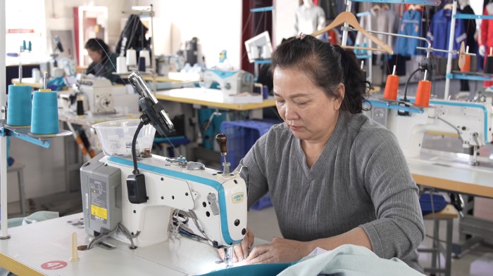 走進社區(qū)工廠,縫紉機的噠嗒聲此起彼伏,工人們正忙著裁剪、縫紉、鎖邊,一件件款式新穎的服裝在流水線上逐漸成型。今年56歲的劉彩霞是黃甫鎮(zhèn)村民,現(xiàn)居住在新府山移民搬遷住宅區(qū),她正端坐縫紉機前,雙腳有節(jié)奏地輕踩踏板,雙手嫻熟推送著布料。銀針翻飛的瞬間,原本平整的衣料便縫合出筆直工整的側(cè)縫。作為工廠第一批入職的員工,她最懂這份“家門口務工”的踏實與安心。“我2018年開始在社區(qū)工廠上班,走十分鐘就到廠了,每月有穩(wěn)定收入,還不耽誤照看娃娃!眲⒉氏颊f。 和劉彩霞一樣,家住府谷縣東路社區(qū)的武水霞也是社區(qū)工廠的受益者。此刻,她正手持布料,踩著縫紉機專注作業(yè),不多時,一件服裝半成品便初具雛形。她從16歲就學習縫紉技藝,之前靠著小鋪面做零散縫紉活兒,收入時好時壞,極不穩(wěn)定。得知扶貧服裝廠擴建招工,她第一時間報名應聘,順利入職,從此捧上了穩(wěn)穩(wěn)的“飯碗”!白詮倪M了工廠,每月收入2000至3000元,日子過得踏實又安心!蔽渌颊f。