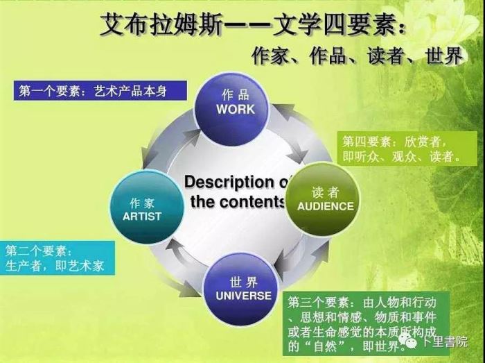 賀玉高先生 中國古代書論的幾種模式 藝術(shù)四要素與藝術(shù)理論體系的建立 美國學(xué)者M.H.艾布拉姆斯在他的《鏡與燈——浪漫主義文論及批評傳統(tǒng)》一書中提出文學(xué)是一種活動,由四個相關(guān)的要素構(gòu)成,即作品、世界、作家、讀者,四者共同構(gòu)成文學(xué)活動。