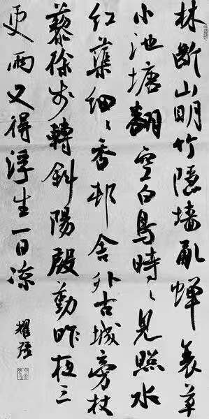 觀孫耀強書法,第一印象是清新質(zhì)樸,剛健灑脫。二王行書之古淡玄遠,用筆之剛健飄逸,體勢之流美多變,有如古塤音樂旋律般在耀強筆下緩緩地展開。但當你仔細品味,你會發(fā)現(xiàn),耀強的書法也并非完全重復(fù)古人,比之二王書法,有了一點屬于自己的質(zhì)樸之氣。另外,部分作品結(jié)字的疏闊,用筆的直抒胸臆,以及對漲墨的運用,都可以看出他有意識地追求藝術(shù)表現(xiàn)。但整體來看,這些都被控制在法度之內(nèi)。風(fēng)格的呈現(xiàn)是自然流露的。所謂“書為心畫”、“書如其人”,這一點在耀強這里再次獲得了印證。多年從事行政工作的他,為人處事進退有矩但又靈動活潑;成長自農(nóng)村家庭的耀強,灑脫沉穩(wěn)中始終透著一股淳樸之氣。這種淳樸之氣,是自然帶來的,非刻意而為之。