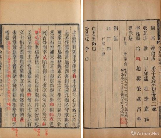 張廷濟(jì)批!督鹗途幰话倭怼啡 (清)王昶撰 清嘉慶十年(1805)王昶初刻本 44冊(cè) 紙本 鑒藏印:廷濟(jì)(朱) 張叔未(白) 張廷濟(jì)印(白) 張廷濟(jì)印(朱白) 半框:19.2×14cm 開本:24.3×15.8cm 此書問世以來,金石學(xué)家多有續(xù)補(bǔ)。西泠春拍中的此套《金石萃編》一百六十卷全帙,內(nèi)有張廷濟(jì)通篇朱墨筆批校萬余言,時(shí)間跨度較長,落有年款的分別有嘉慶壬申(1812),嘉慶庚辰(1820),審其筆跡主要是道光之后的批校。張廷濟(jì)依據(jù)原碑、自藏及友人藏舊拓,以及翁方綱《兩漢金石志》、朱彝尊《曝書亭集》、錢大昕《潛研堂集》、王澍《虛舟題跋》等乾嘉學(xué)者著述考訂碑文,考證史實(shí),具有重要?眱r(jià)值。