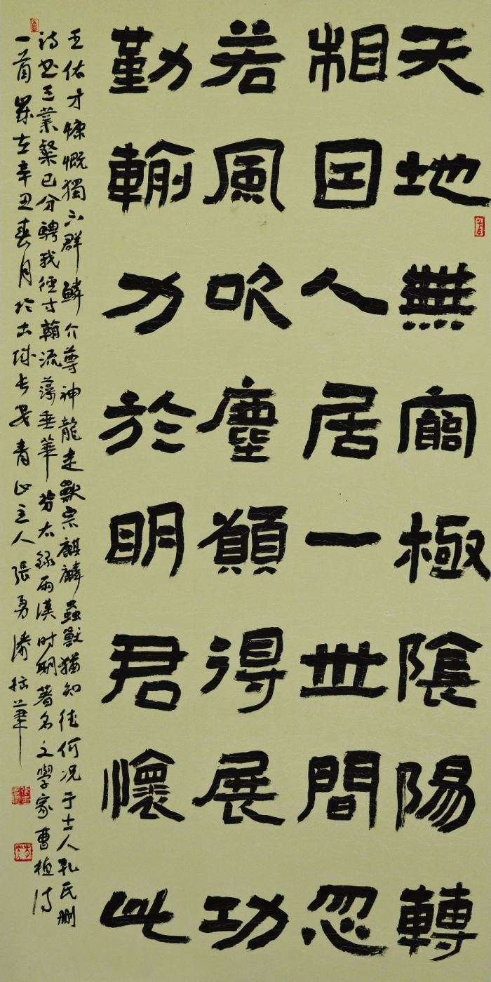 有了篆隸書深厚之基礎(chǔ),在行草書中,線條之張力,各種各樣變化就體現(xiàn)出來,即興書寫之過程,對線超強(qiáng)之把控能力,筆底要有一定功夫,需要時(shí)間之磨礪,就像一塊石頭,天天不懈地磨練,手上之功夫就有了,要保持平常心、永恒之心態(tài)去做。不同碑體,要有篆隸書筆法之積累,否則寫漢碑就是描摹,不是寫出來之一種狀態(tài)。我思考一是面對經(jīng)典之態(tài)度,二是解讀經(jīng)典之途徑,三是創(chuàng)作經(jīng)典之途徑,這三個(gè)方面極為重要,對于經(jīng)典永遠(yuǎn)都要靠近,就像人之生存,飲食始終離不開主食的,這和書法一樣,經(jīng)典之東西永遠(yuǎn)都不會沉淪。一個(gè)認(rèn)真之態(tài)度,解讀要有深度,始終靠近經(jīng)典,在創(chuàng)作中精神境界才有高度,這是一個(gè)龐大之體系,不是短時(shí)間就能有效的。