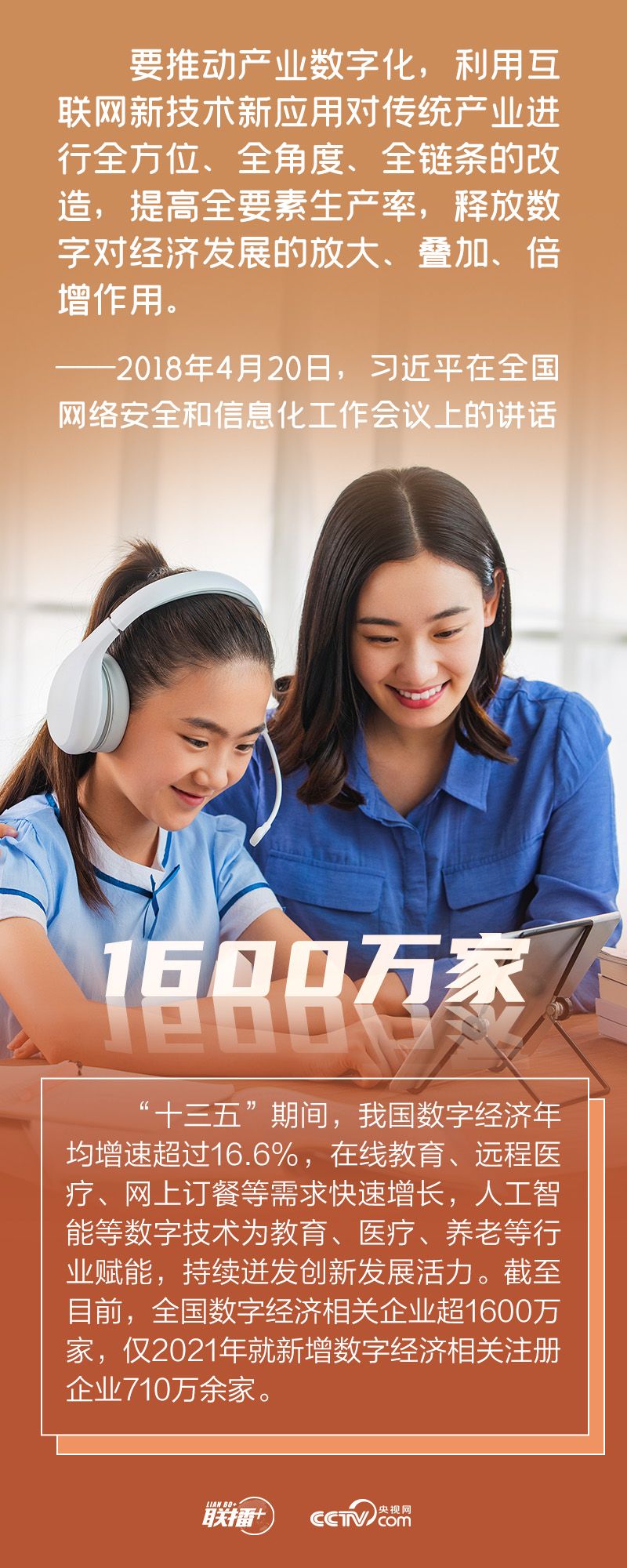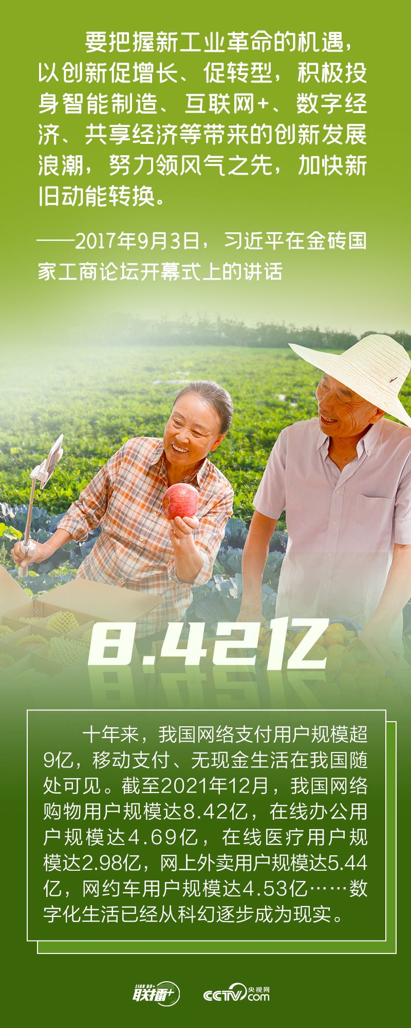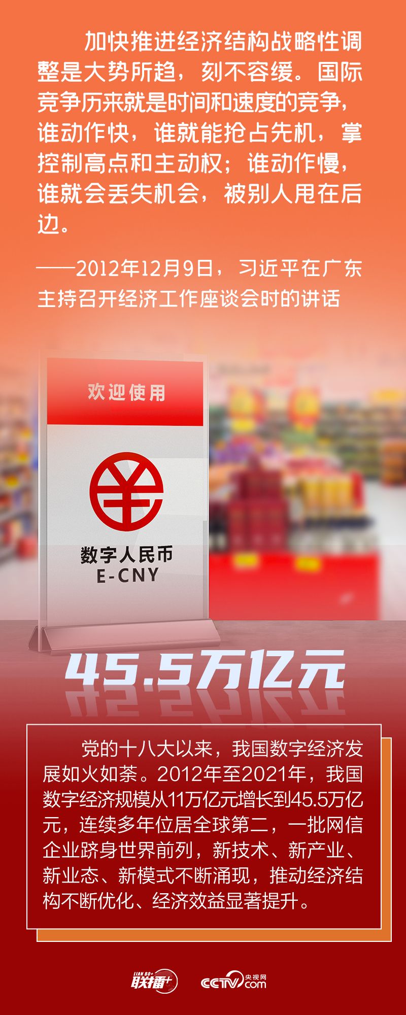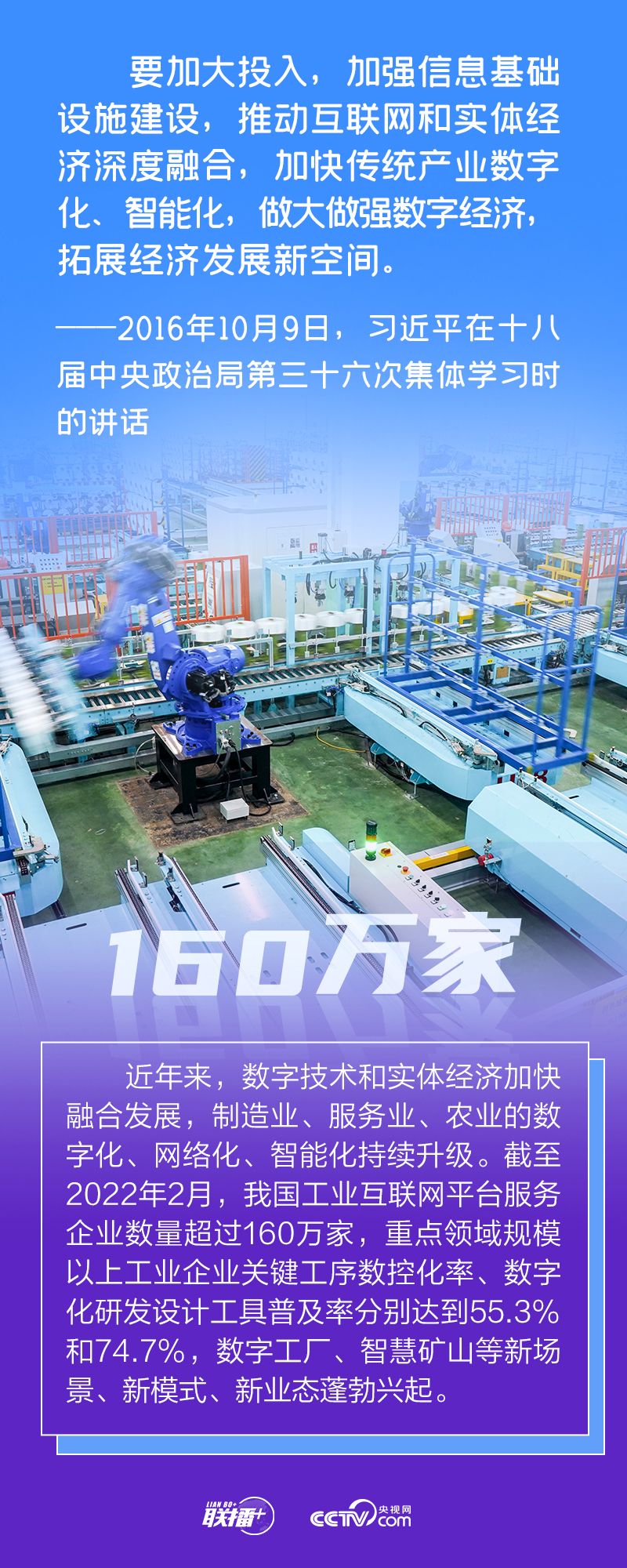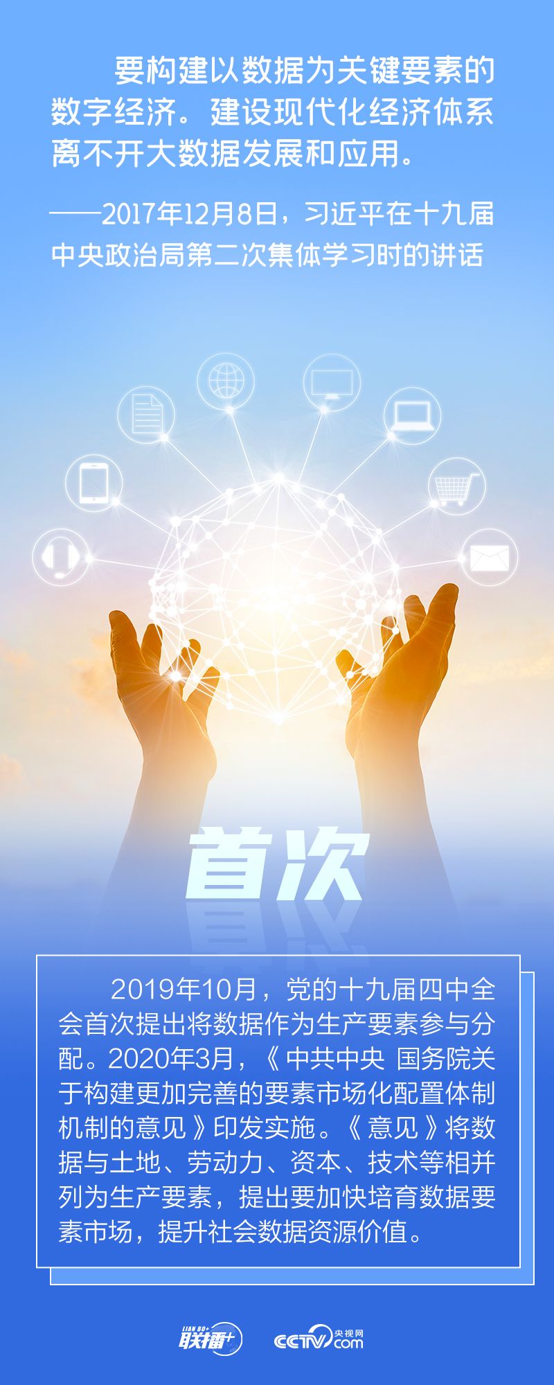 網(wǎng)絡強國 | 搶占未來發(fā)展制高點聯(lián)播+“當今時代,數(shù)字技術、數(shù)字經(jīng)濟是世界科技革命和產(chǎn)業(yè)變革的先機,是新一輪國際競爭重點領域,我們一定要抓住先機、搶占未來發(fā)展制高點! 黨的十八大以來,以習近平同志為核心的黨中央高度重視發(fā)展數(shù)字經(jīng)濟,出臺一系列重大政策、作出一系列戰(zhàn)略部署,推動我國數(shù)字經(jīng)濟發(fā)展取得顯著成就,為經(jīng)濟社會高質量發(fā)展注入強勁動能。 央視網(wǎng)《聯(lián)播+》“數(shù)說新時代”系列特推出創(chuàng)意海報,與您一同學習。