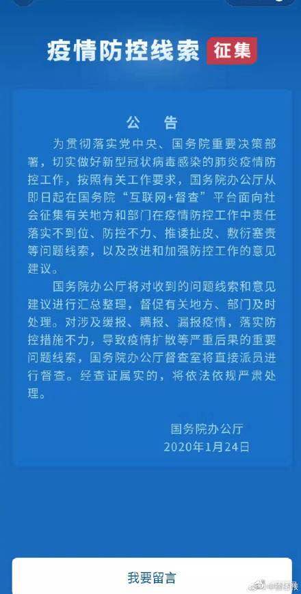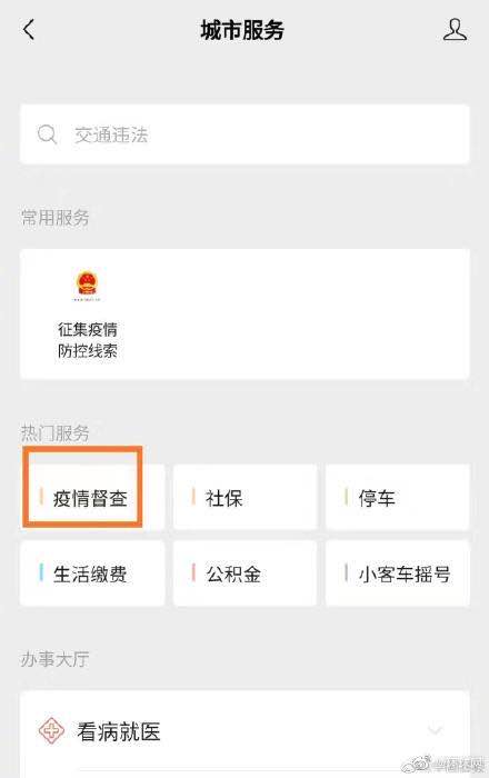 轉(zhuǎn)發(fā)周知!微信開通疫情線索征集入口24日起,國務(wù)院辦公廳在國務(wù)院“互聯(lián)網(wǎng)+督查”平臺面向社會征集有關(guān)地方和部門在疫情防控工作中責任落實不到位、防控不力、推諉扯皮、敷衍塞責等問題線索,以及改進和加強防控工作的意見建議,F(xiàn)在,打開微信進入支付界面,點擊城市服務(wù),選擇“疫情督查”,就可以跳轉(zhuǎn)到國務(wù)院的征集頁面了!轉(zhuǎn)發(fā),周知!
