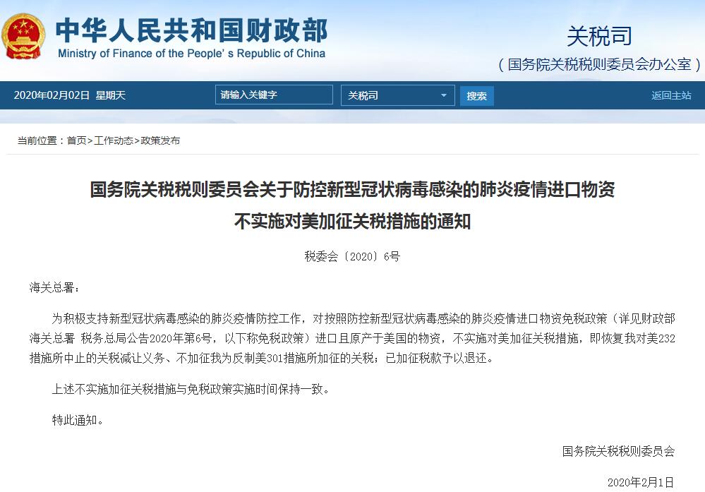 國(guó)務(wù)院關(guān)稅稅則委員會(huì):防控疫情進(jìn)口物資不對(duì)美加征關(guān)稅